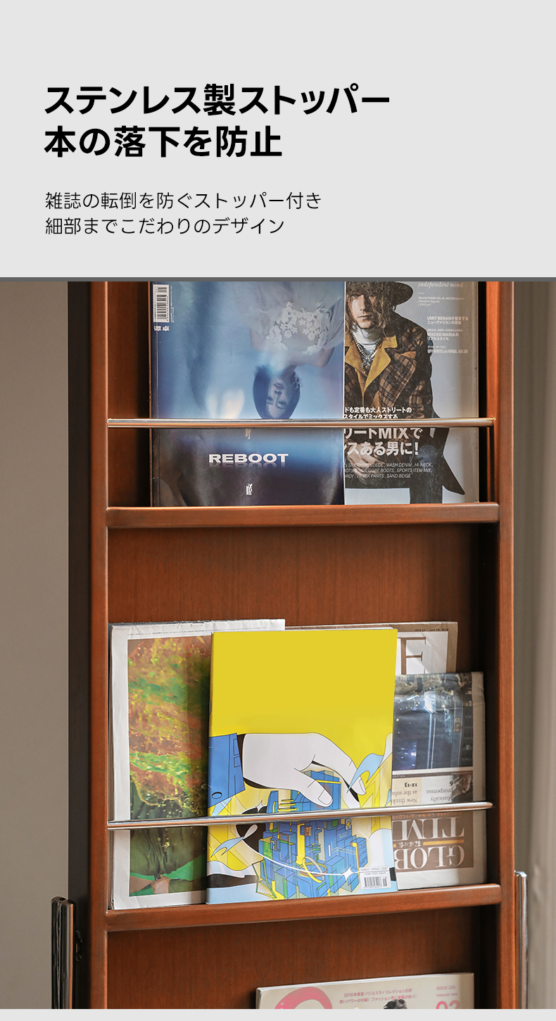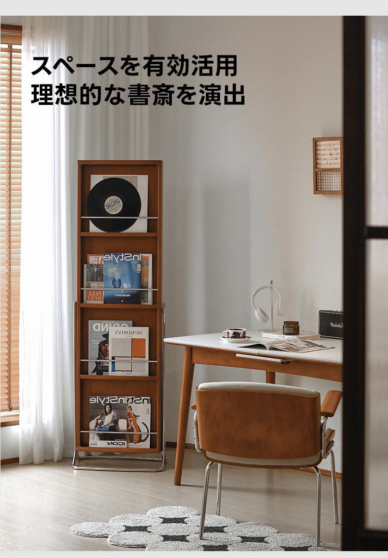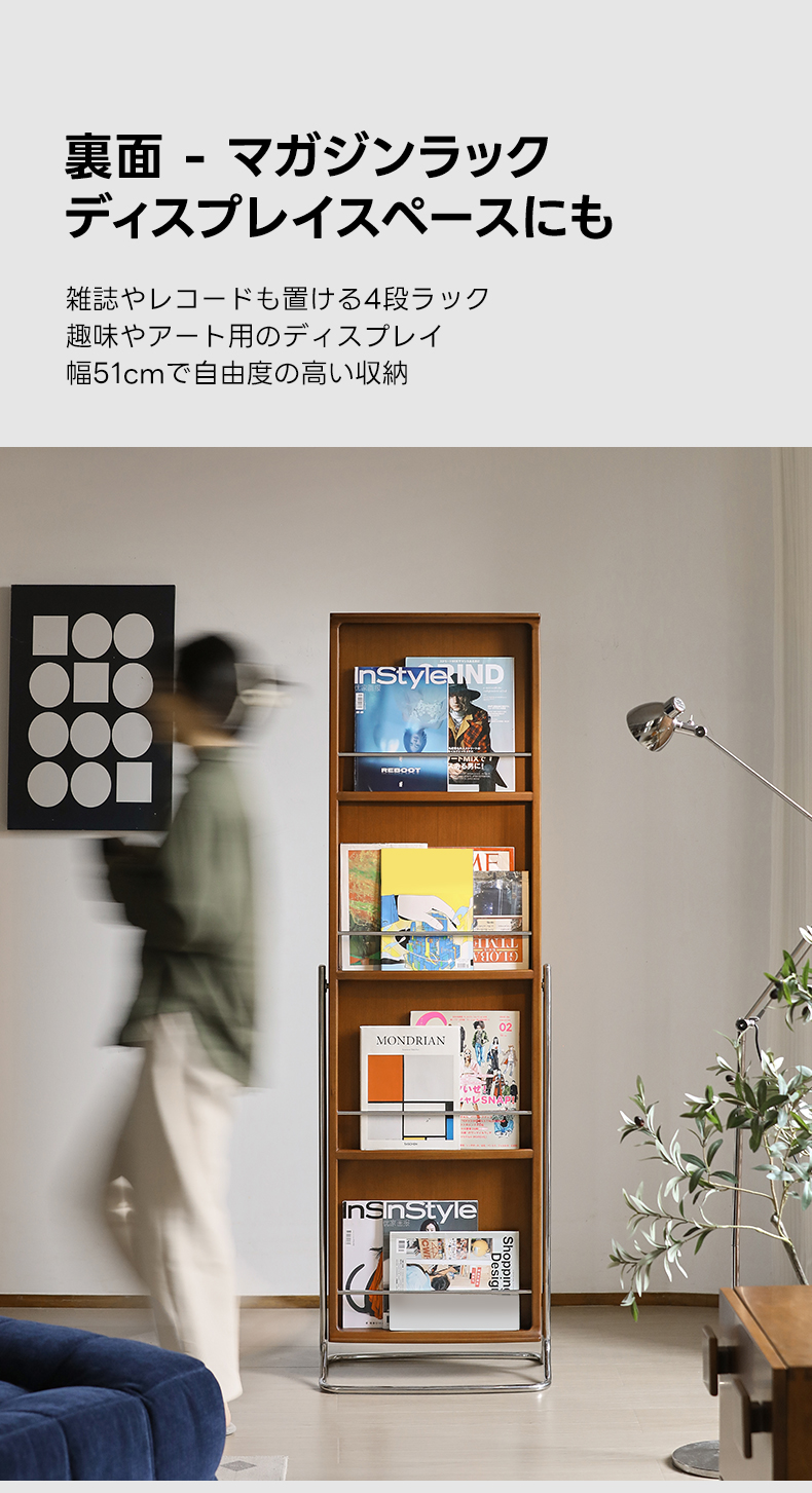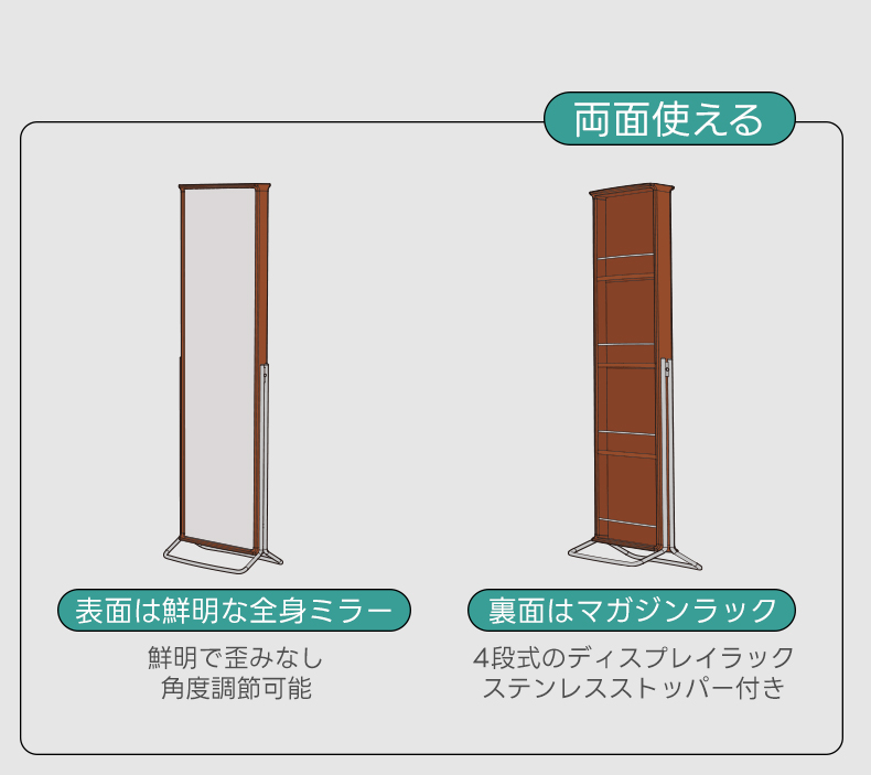 - 【多機能で便利なデザイン】両面使用可能な設計で、表面は全身ミラー、裏面は4段式のマガジンラックとして利用可能です。雑誌やレコードの収納に便利で、リビングや寝室、玄関など様々な場所にフィットします。