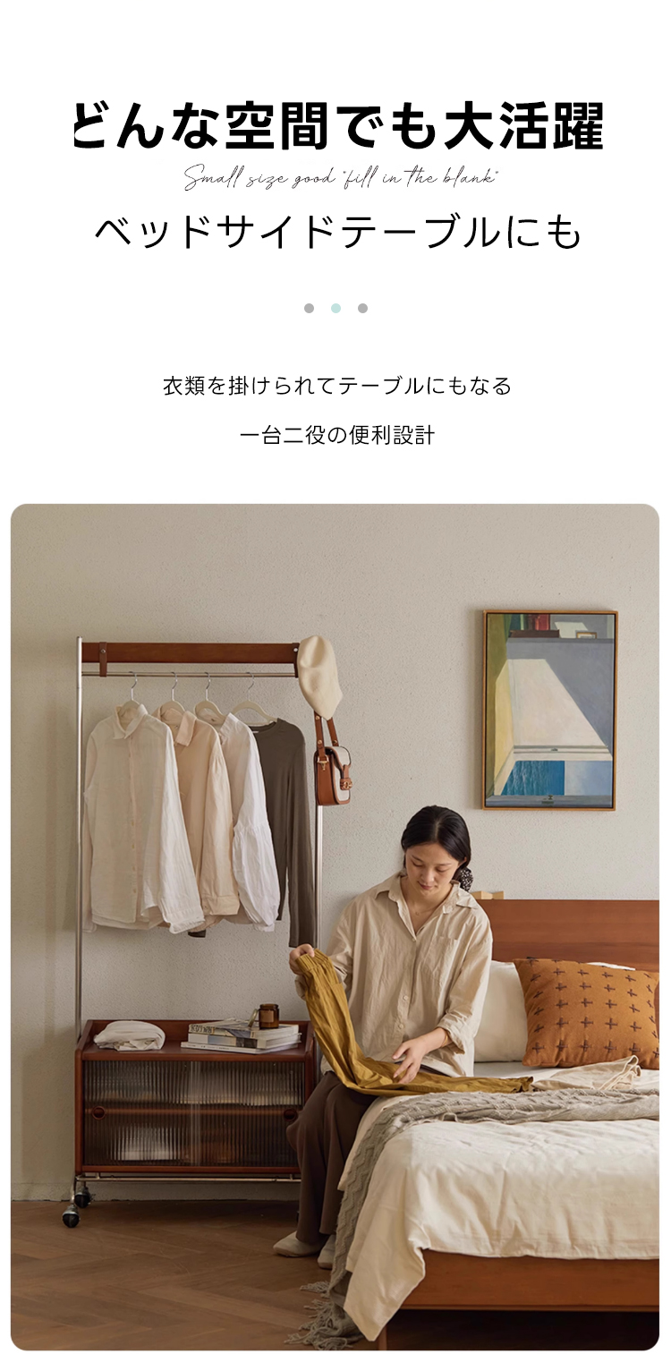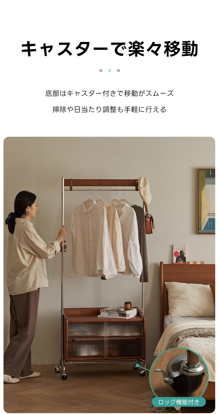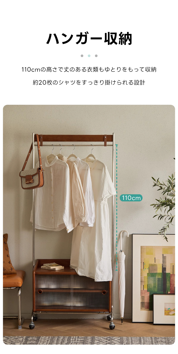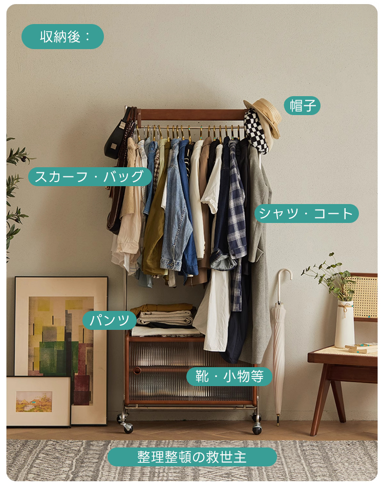 - 【多機能収納で整理整頓】:このフロアハンガーは、衣類を掛けるだけでなく、下部に収納キャビネットを備えています。シャツや小物を整理しやすく、サイドテーブルとしても利用可能です。キャスター付きで移動が簡単、部屋のどこにでも配置できます。