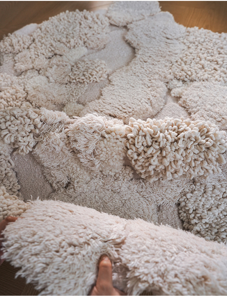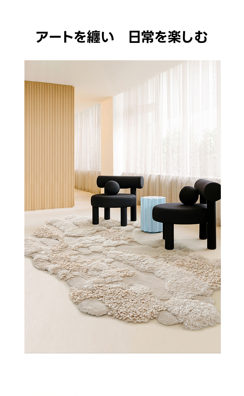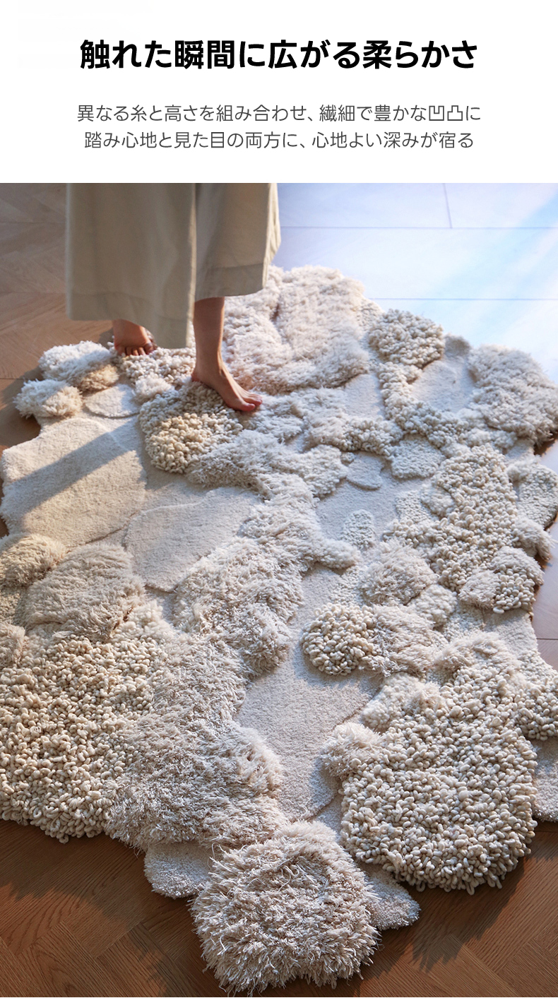 - 【高級感あふれるウールラグ】スノーフォレストラグは、ウール、ポリエステル、竹繊維を組み合わせた高級感あふれるラグです。約40mmの長毛が足元を優しく包み込み、贅沢な踏み心地を実現します。不規則な形状がどんなインテリアにも自然に溶け込み、空間を一層引き立てます。