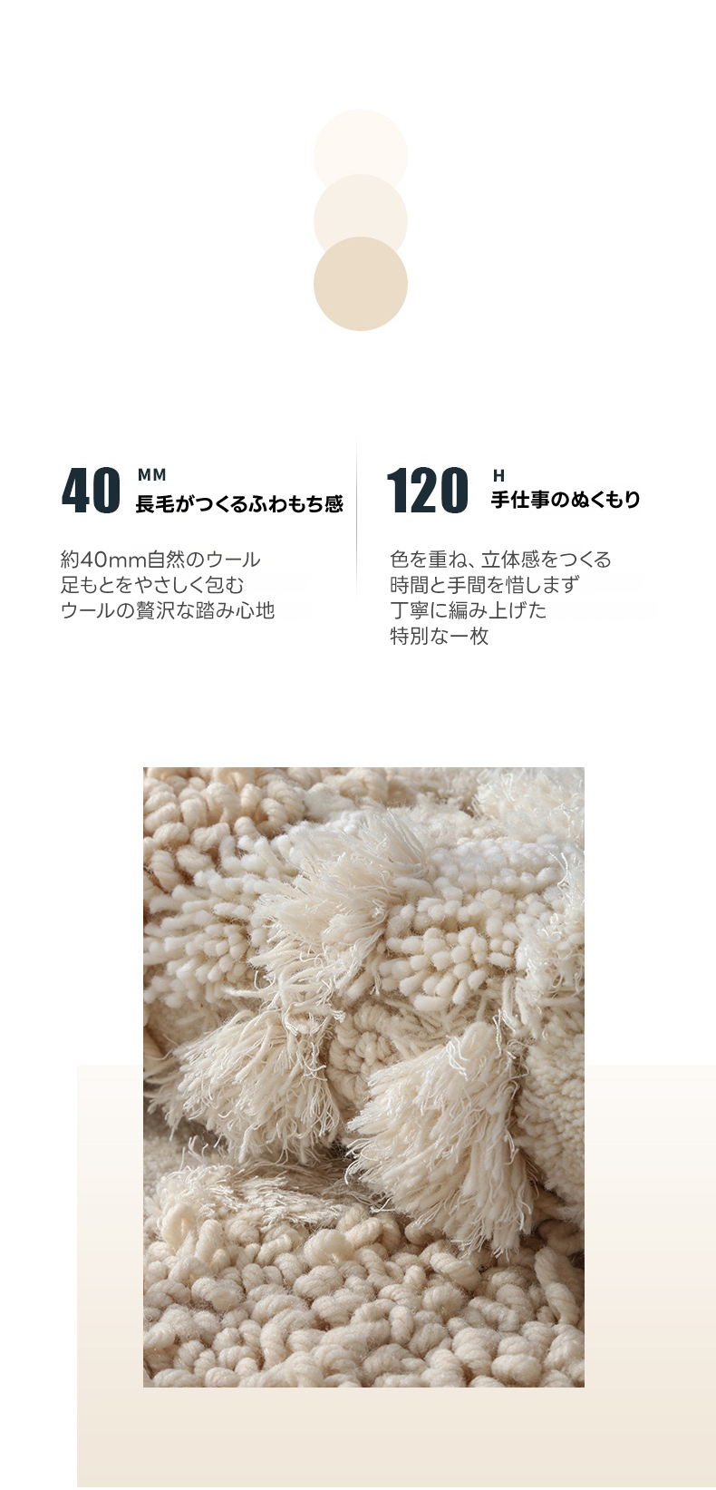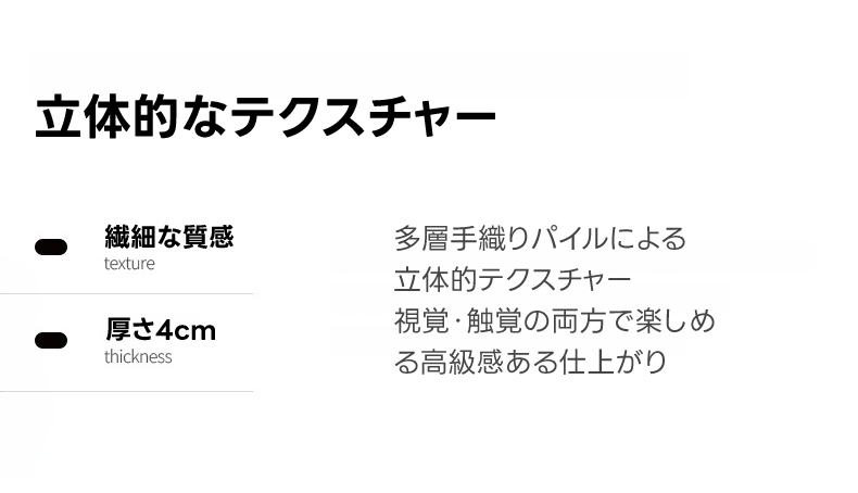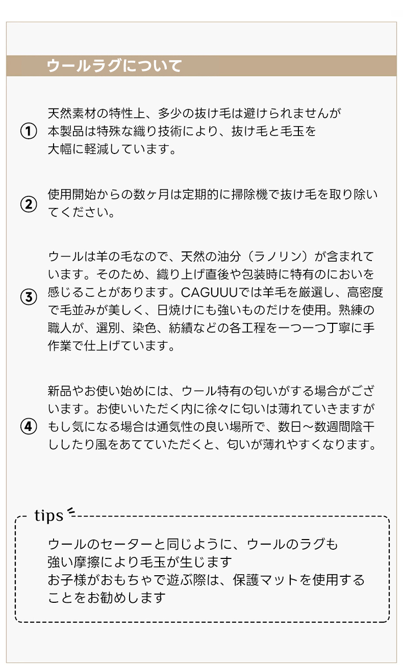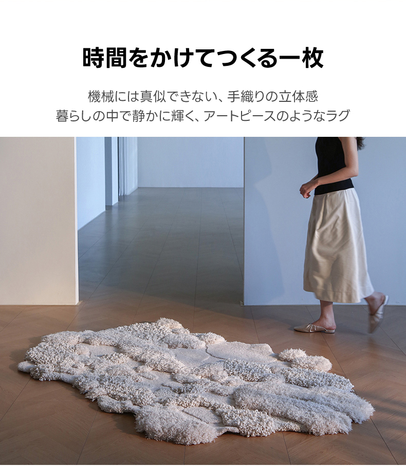 - 【快適な使用体験】ウール特有の自浄作用があり、清潔な状態を維持できます。定期的な掃除機がけで、長く美しい状態を保つことが可能です。職人の手仕事による丁寧な仕上げが、日常を豊かに彩ります。