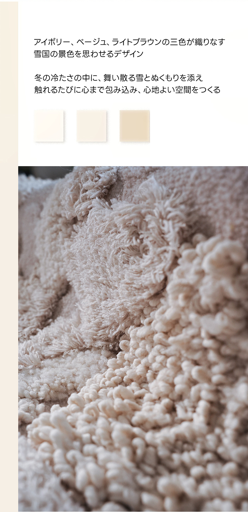 - 【手織りによる立体感】手織りによる立体感が特徴のスノーフォレストラグは、視覚と触覚の両方で楽しめる仕上がりです。雪国の風景を思わせるアイボリー、ベージュ、ライトブラウンの三色が織りなすデザインで、日常にアートを取り入れたい方にぴったりです。