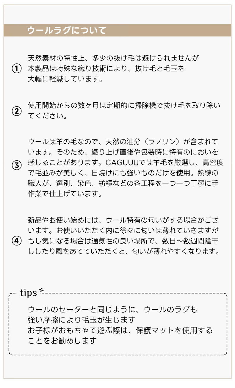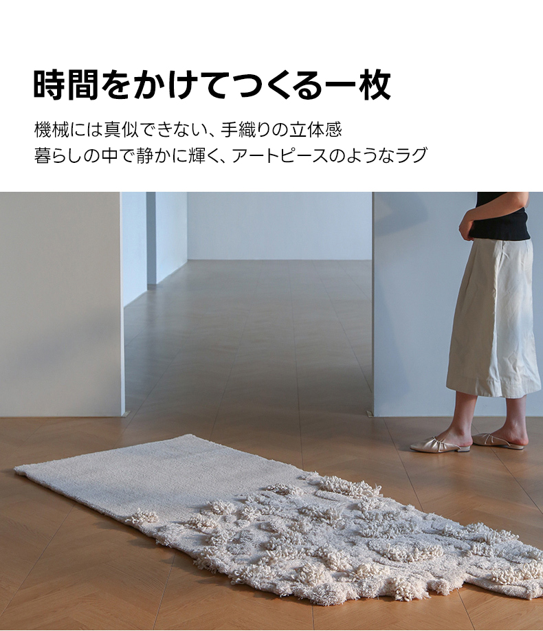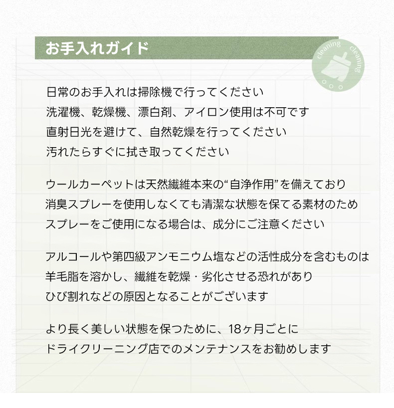 - 【心地よい使用体験】:ウールの自然な温かみと手織りの立体感を楽しみながら、心地よい時間をお過ごしください。定期的な掃除機がけで光沢と清潔さを保ち、汚れた部分は湿らせた布で簡単にお手入れ可能です。