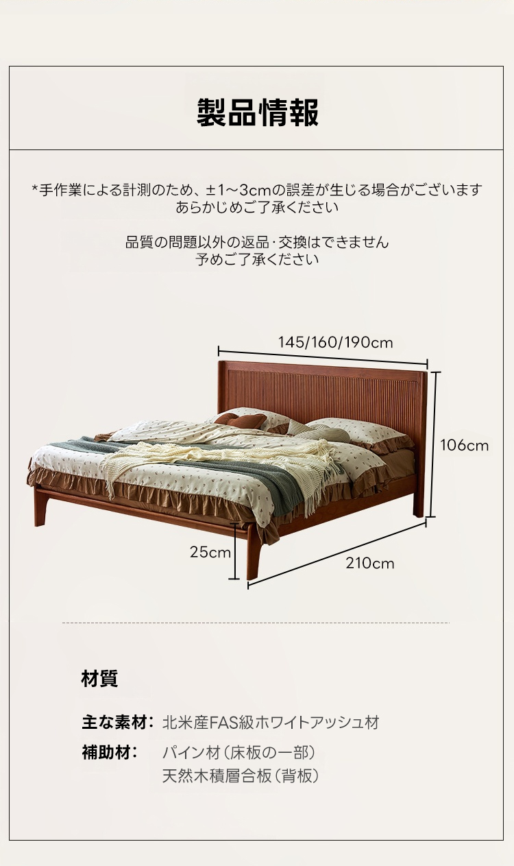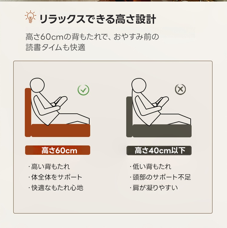 - 【快適な使用体験】:高さ60cmの背もたれが体全体をサポートし、快適なもたれ心地を提供します。スリムなフットボードは動線をスムーズにし、コンパクトな寝室にも最適です。