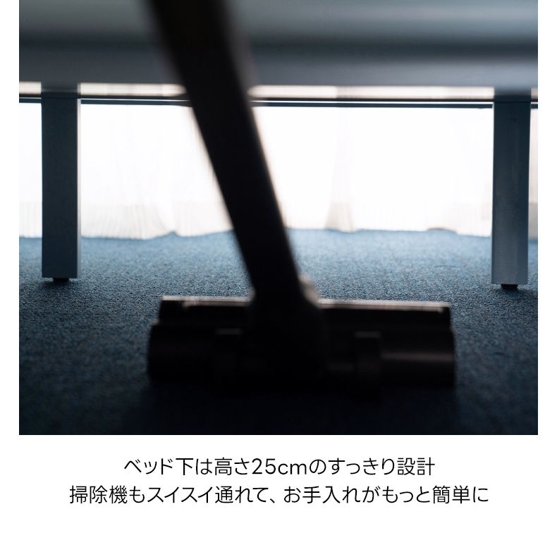 - 【快適な使用体験】:ベッド下の高さは25cmあり、掃除機がスムーズに通るため、お手入れが簡単です。ヘッドボードの裏には5cmの小物スペースがあり、スマホやメガネを置くのに便利です。
