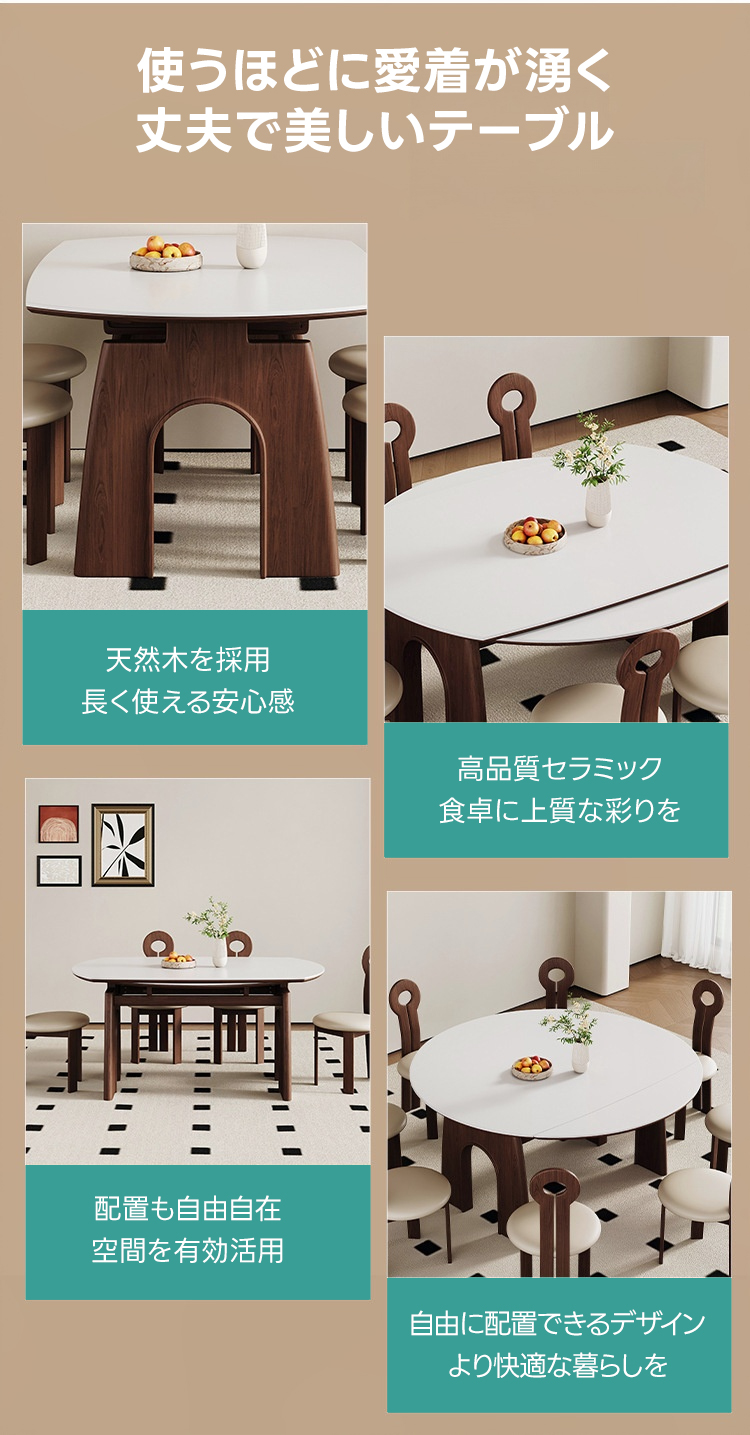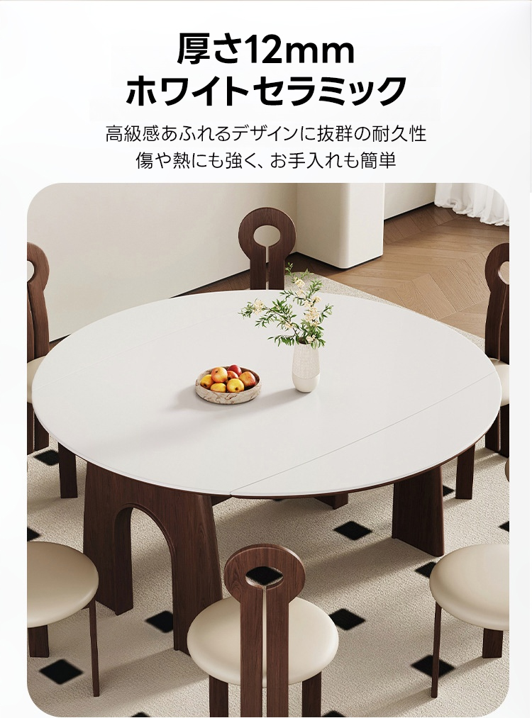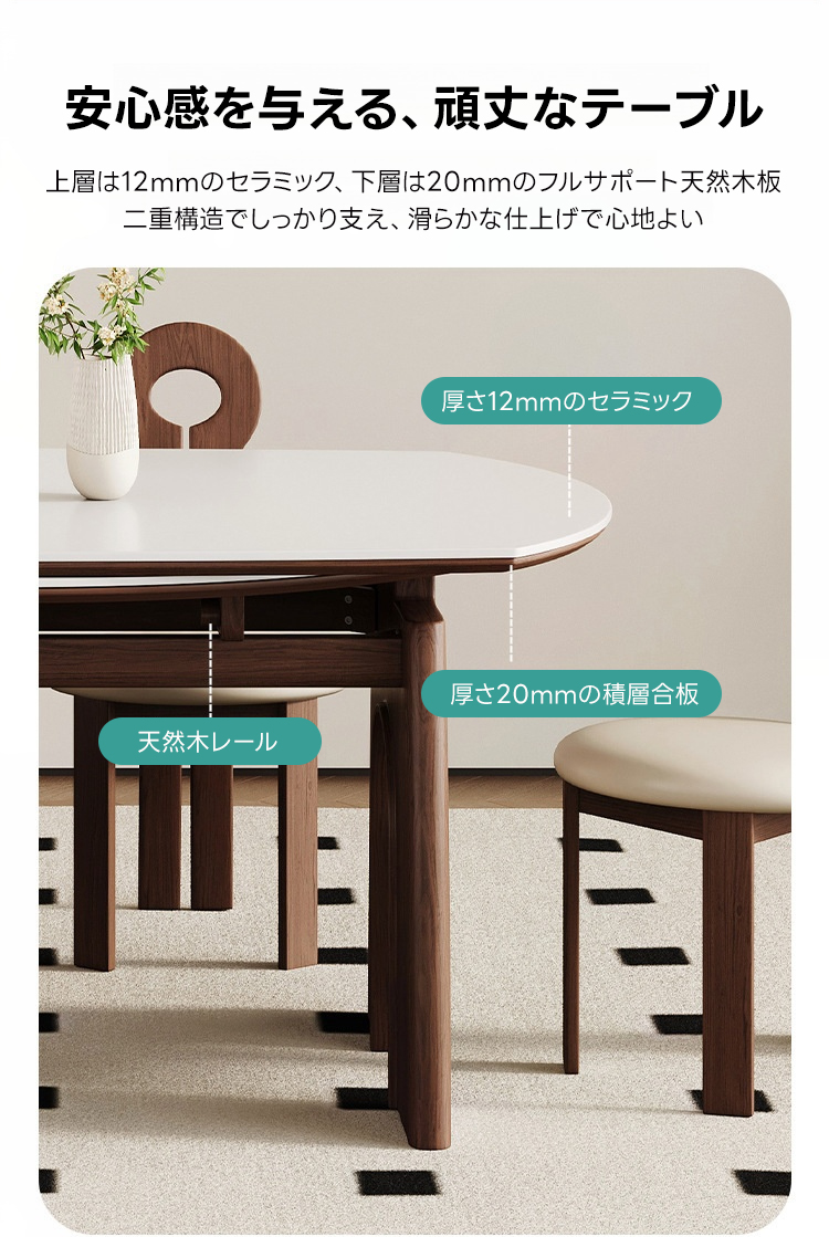 - 【高品質な素材とデザイン】:12mm厚のセラミック天板は、耐久性に優れ、傷や熱に強く、手入れも簡単です。頑丈なオーク材の脚部が安定感を提供し、長期間の使用にも耐えます。