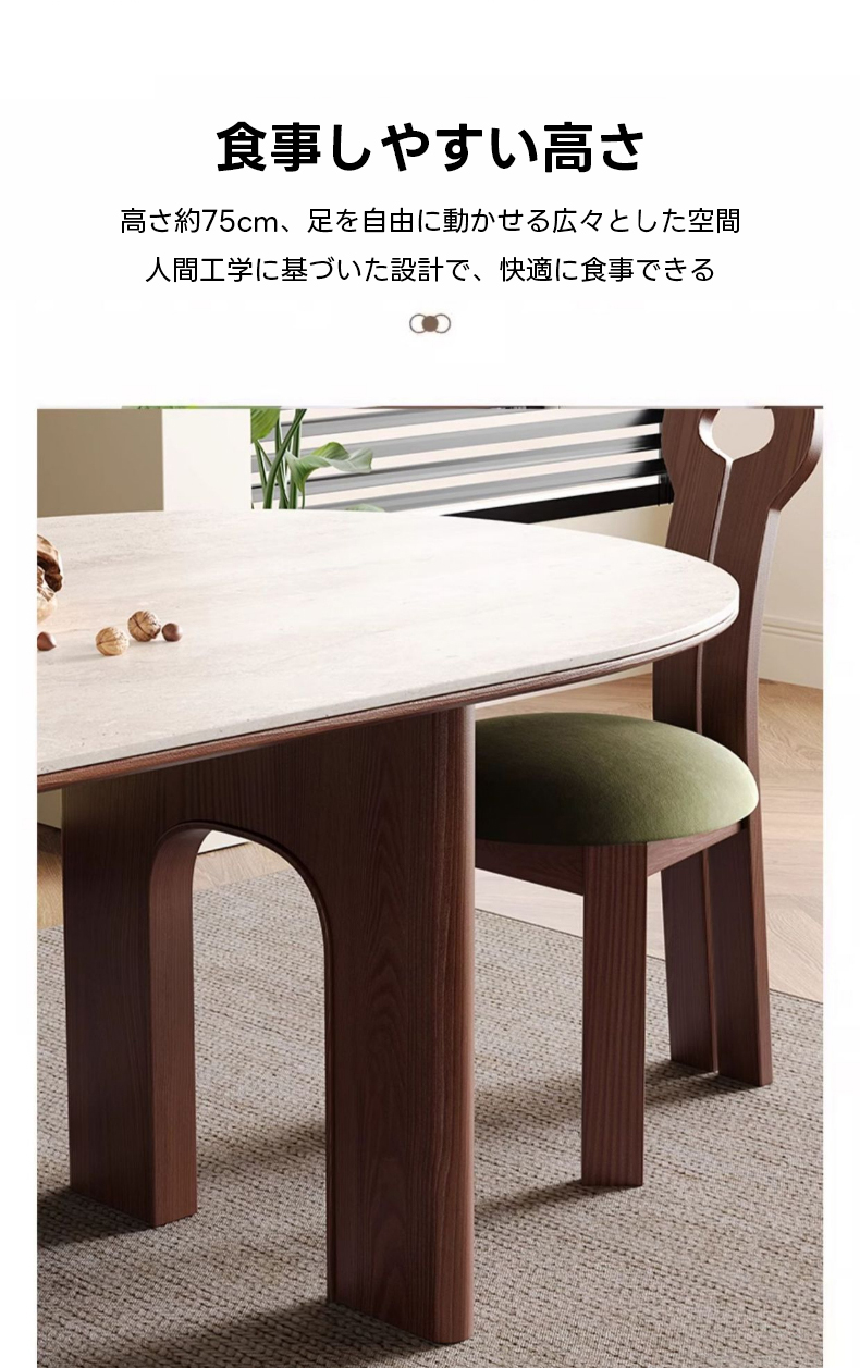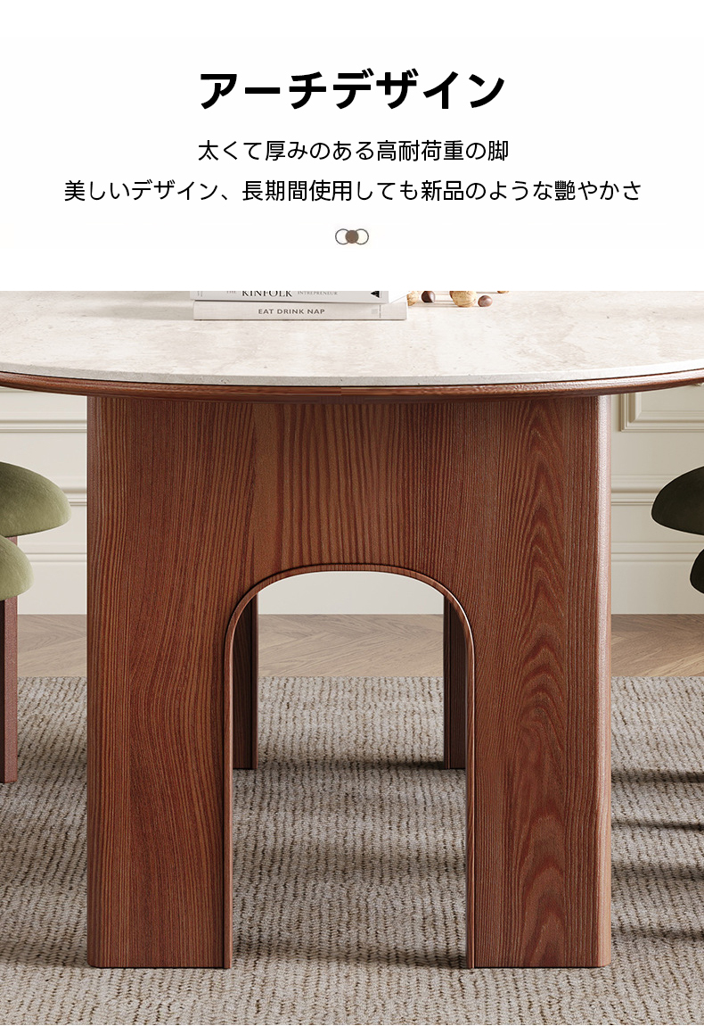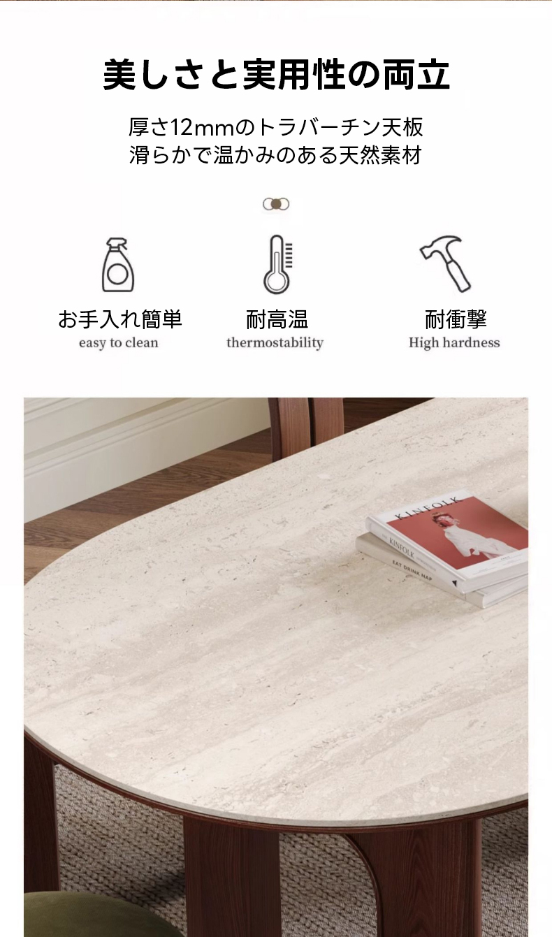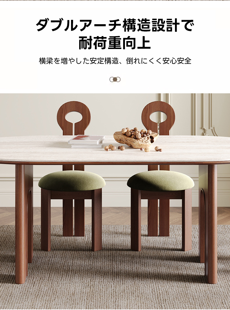 - 【高品質な素材と設計】:天板にはイタリア製トラバーチンを使用し、脚部には北米産アッシュ材を採用。ダブルアーチ構造で安定感と耐荷重性を強化し、長くご愛用いただけます。