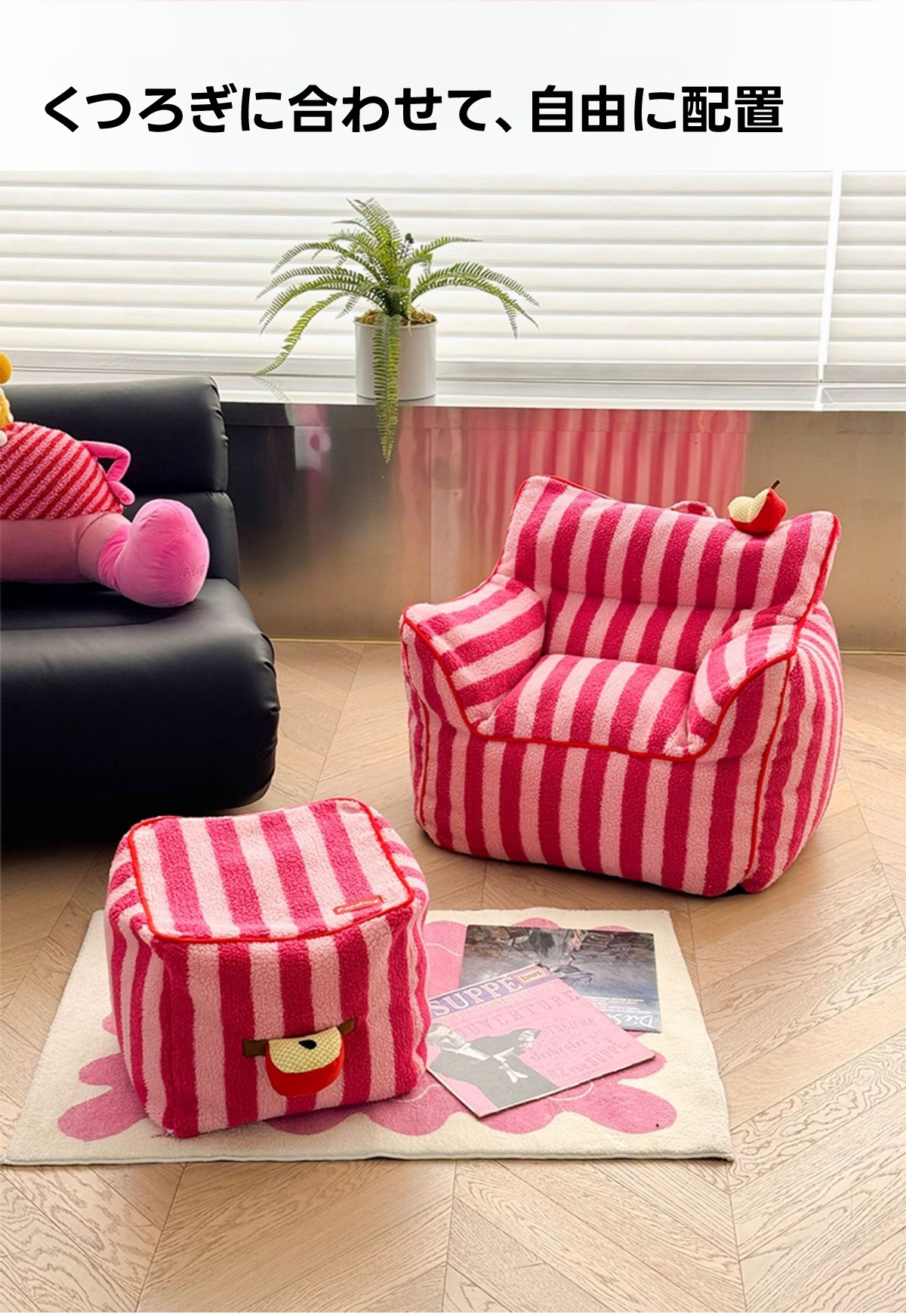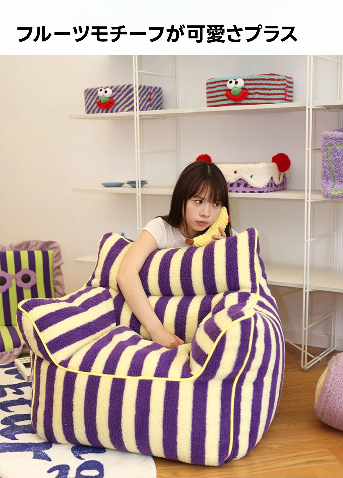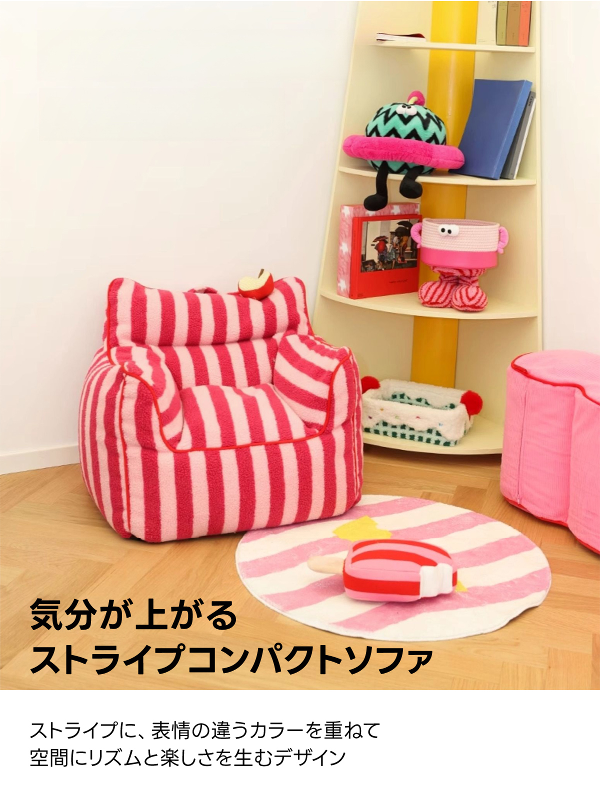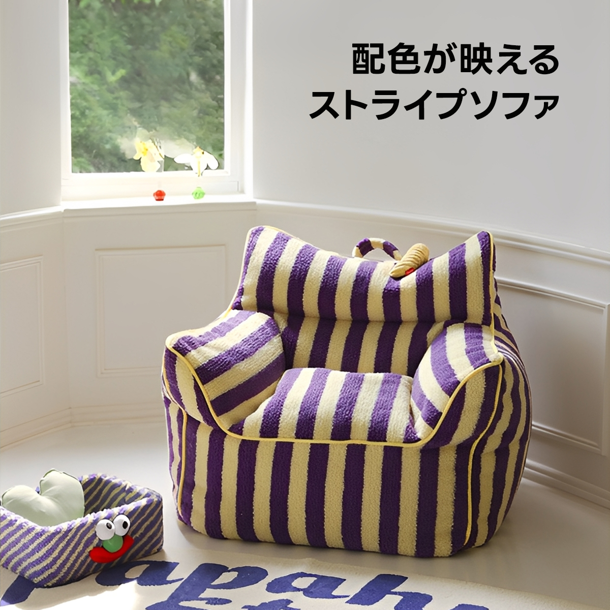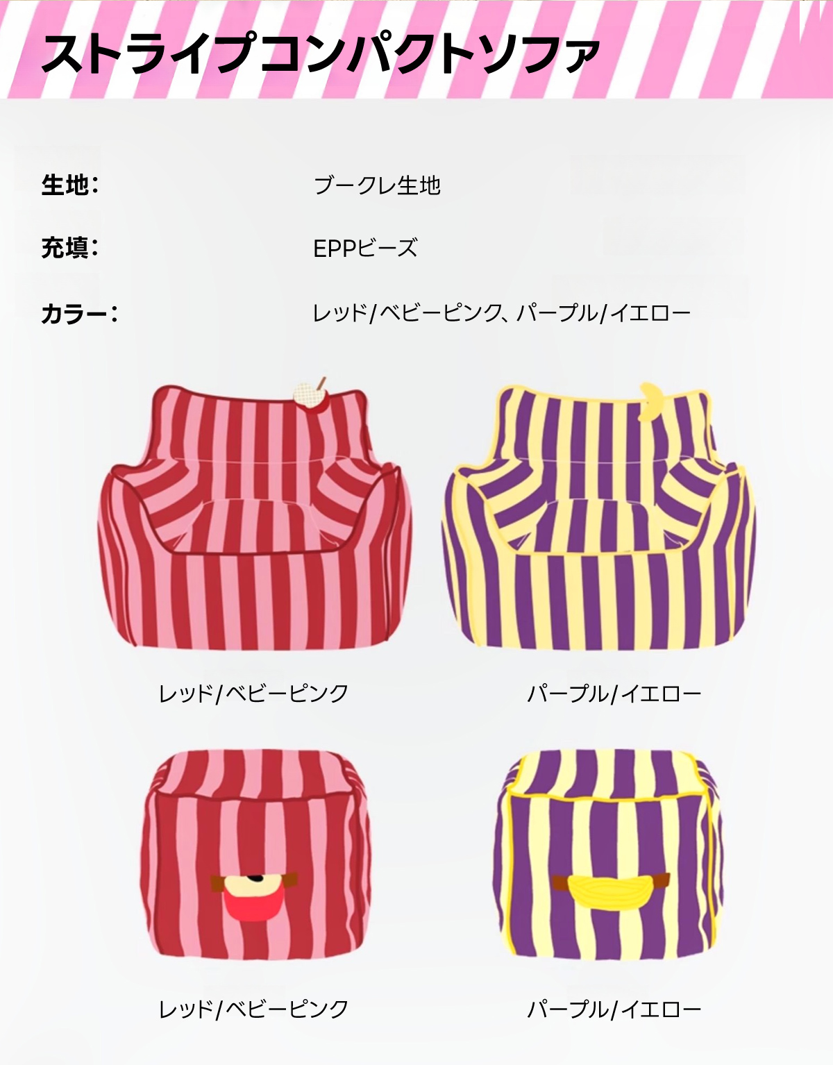 - 【鮮やかなデザインで空間を彩る】ストライプコンパクトソファは、カラフルなストライプ柄でお部屋にリズムと楽しさをプラスします。リビングや寝室にぴったりで、インテリアに合わせてレッド/ベビーピンクとパープル/イエローの2色から選べます。