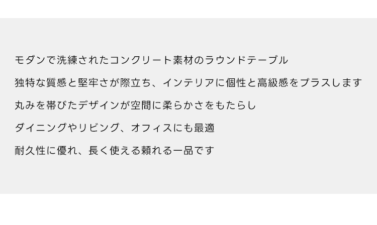 - 【高品質な素材とデザイン】耐久性に優れたコンクリート製で、長く使える信頼の一品です。手作業による製品のため、個々のテーブルに独特の風合いがあり、インテリアに個性と高級感をプラスします。