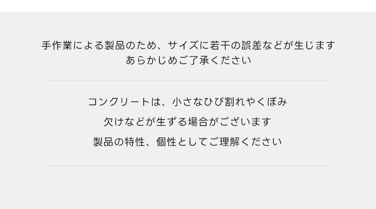 - 【安心のアフターサービス】手作業による製品のため、サイズに若干の誤差が生じる場合がありますが、コンクリートの特性上、小さなひび割れやくぼみも製品の個性としてお楽しみください。