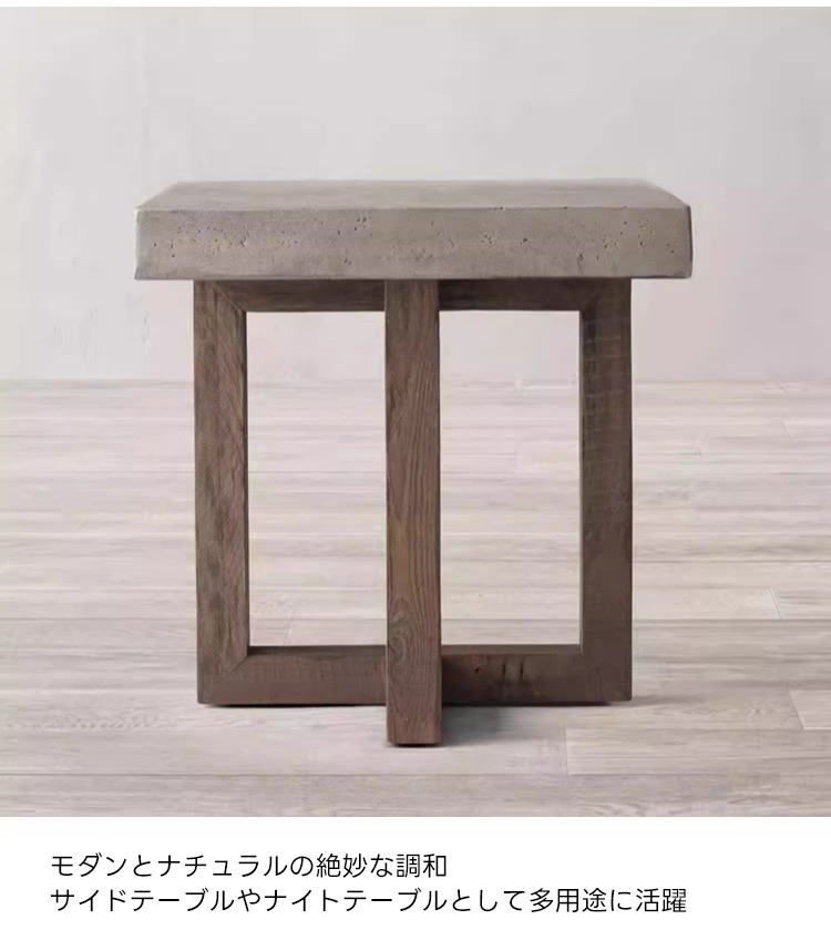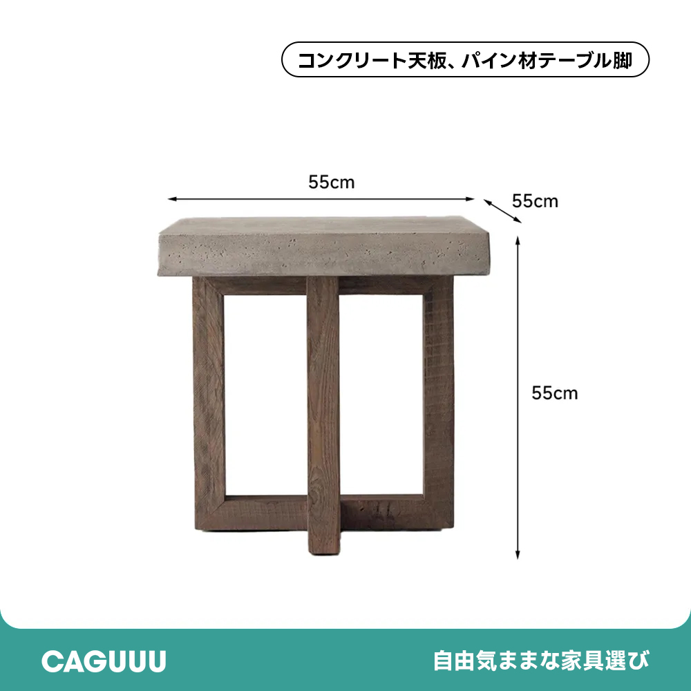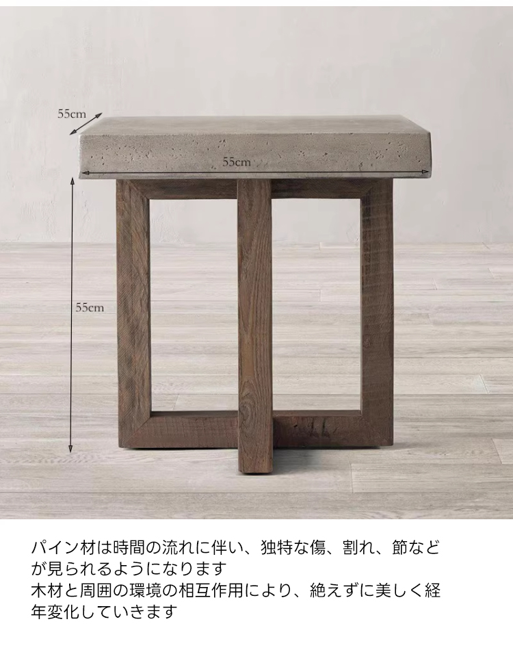 - 【高品質な素材と洗練されたデザイン】コンクリートの天板とパイン材の脚部が組み合わさり、頑丈でありながら洗練された印象を与えます。時間の経過とともに、パイン材には独特の風合いが増し、経年変化を楽しむことができます。