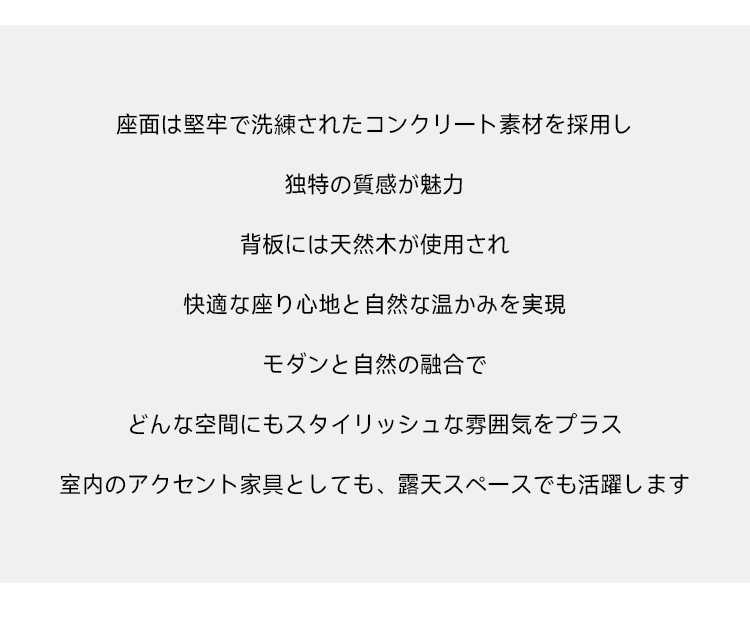 - 【モダンデザインと自然素材の融合】このリクライニングチェアは、モダンなデザインと自然素材の美しさが見事に融合しています。堅牢なコンクリート座面と天然木の背板により、快適な座り心地と自然な温かみを提供します。どんな空間にもスタイリッシュな雰囲気をプラスし、インテリアのアクセントとして最適です。