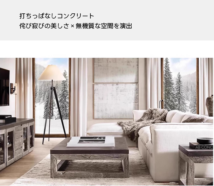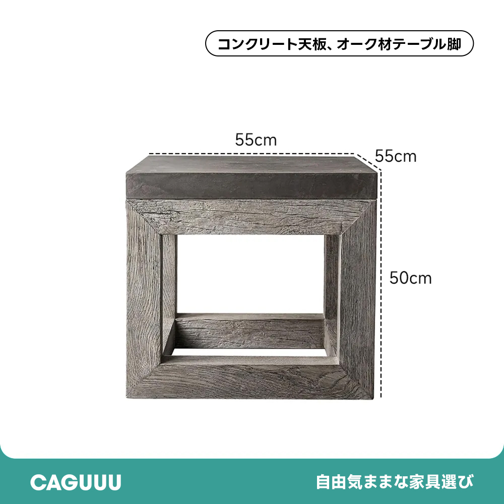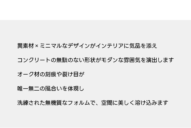 - 【高品質な素材とデザイン】:コンクリートの天板とオーク材の脚部を組み合わせた異素材ミックスが、インテリアに独特のアクセントを加えます。自然素材ならではの温かみを感じさせるデザインが特徴です。
