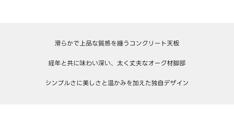 - 【高品質な素材とデザイン】コンクリートの天板は耐久性に優れ、日常使いにも安心です。オーク材の脚部は安定感抜群で、長時間の使用でも劣化しにくい信頼の一品です。洗練されたデザインが空間を特別なものに変えます。