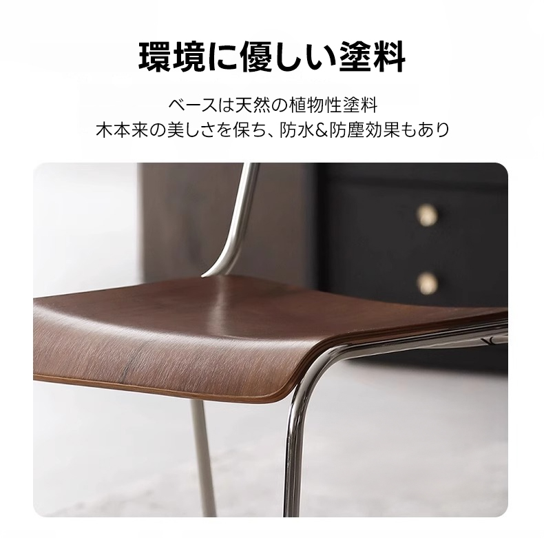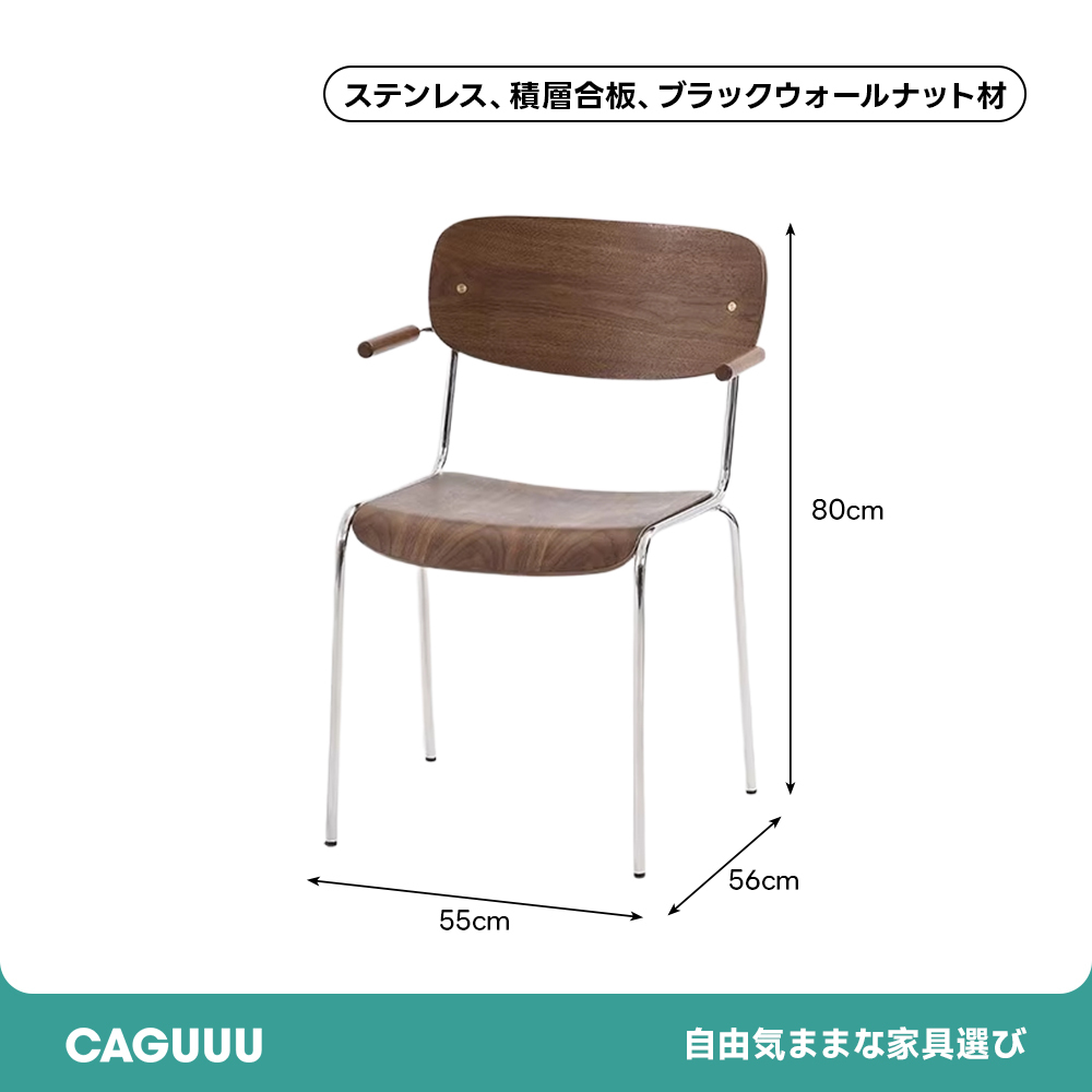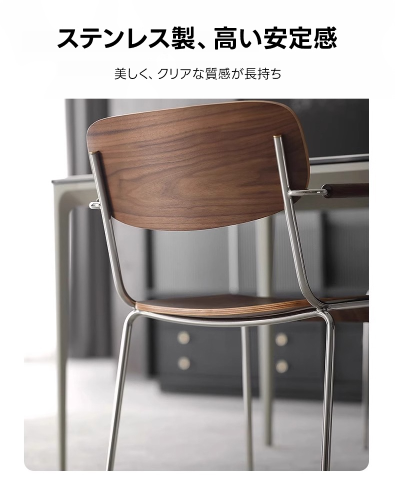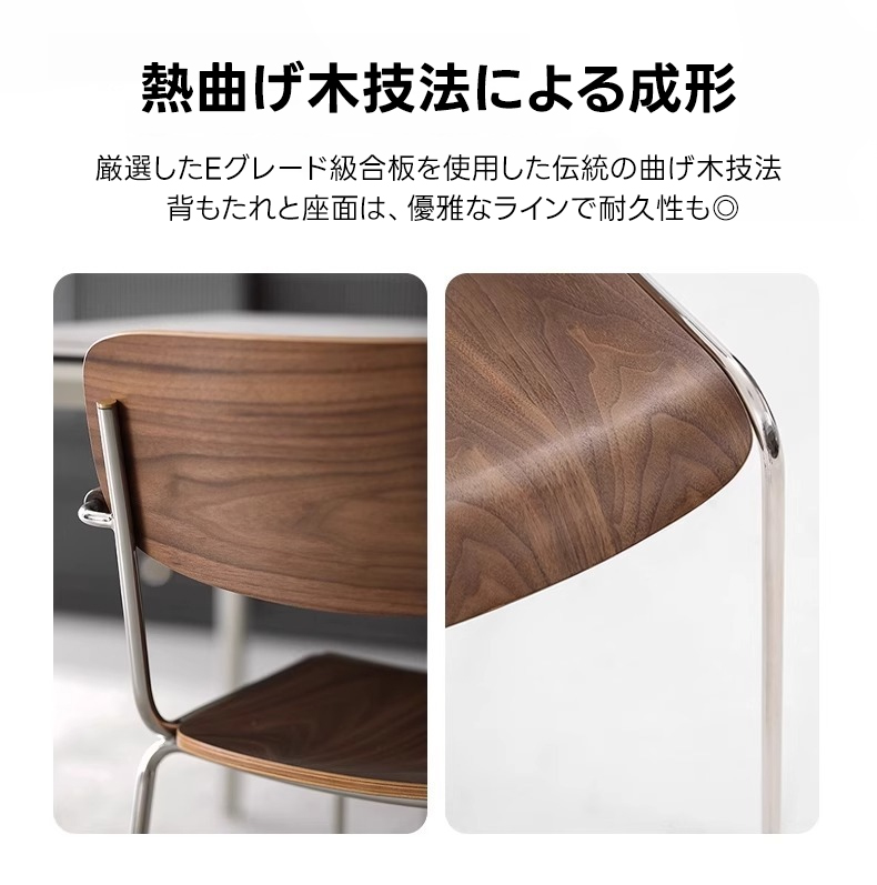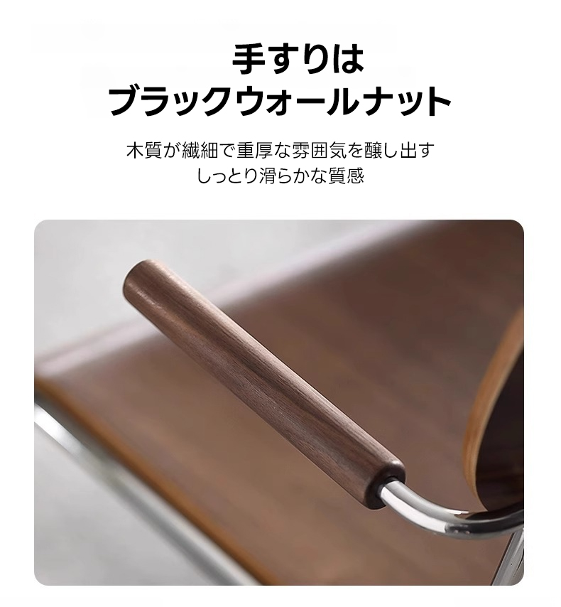 - 【高品質な素材と構造】フレームはステンレス製で、耐久性と安定感があります。座面と背もたれにはE1グレードの合成板を使用し、伝統的な曲げ木技法で成形されています。手すり部分にはブラックウォールナット材を使用し、滑らかな質感と高級感を提供します。