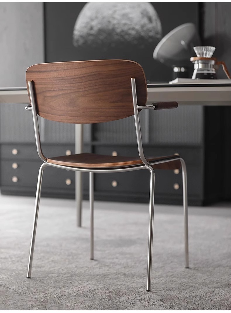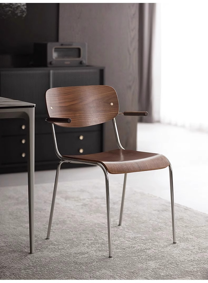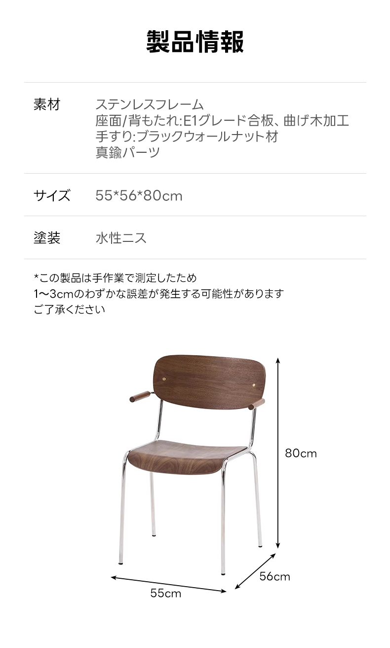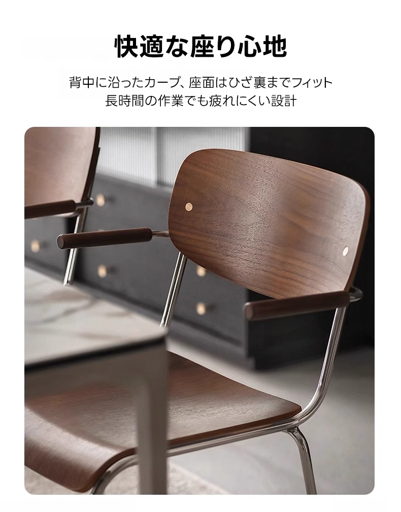 - 【高品質な素材と構造】フレームはステンレス製で、耐久性と安定感があります。座面と背もたれにはE1グレードの合成板を使用し、伝統的な曲げ木技法で成形されています。手すり部分にはブラックウォールナット材を使用し、滑らかな質感と高級感を提供します。