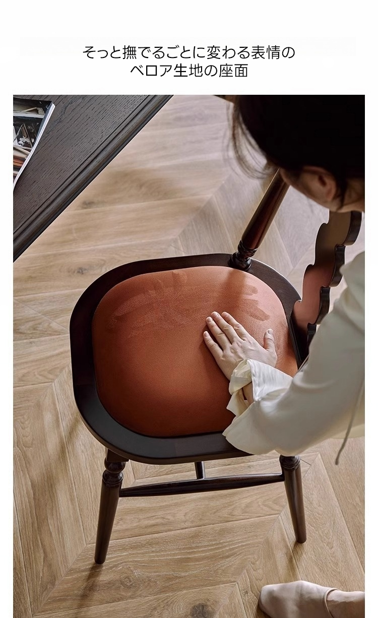- 【高品質な素材と洗練されたデザイン】:北米産レッドオークを使用し、耐久性と美しい木目を兼ね備えたデザイナーズチェアです。ベロア生地の座面は触れるたびに異なる表情を見せ、視覚的にも印象的な不規則デザインが特徴です。