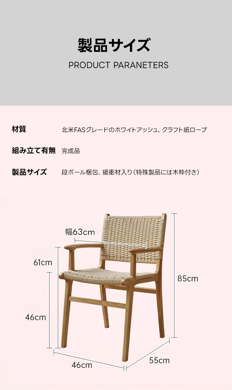 - 【洗練されたデザインと高品質素材】ナチュラルアームチェアは、北米FASグレードのホワイトアッシュとクラフト紙ロープを使用し、耐久性と美しさを兼ね備えたダイニングチェアです。滑らかなラインと整った木目が特徴で、湿気やねじれに強く、ひび割れや変形が起こりにくい設計です。