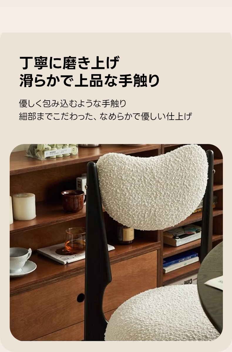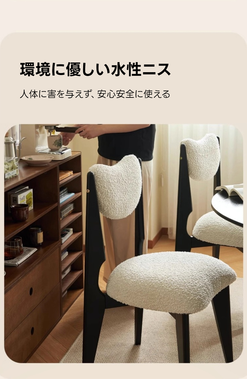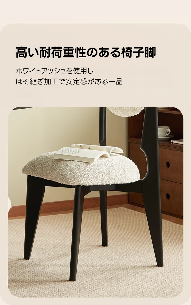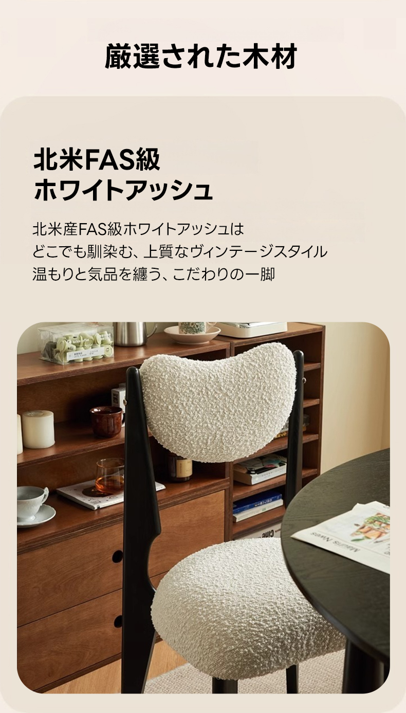 - 【高品質な素材とデザイン】:フレームには北米FAS級ホワイトアッシュを使用し、耐久性と安定感を実現。座面と背もたれには柔らかく心地よいボア生地を採用し、快適な使用感を提供します。環境に優しい水性ニス仕上げで、安心してお使いいただけます。