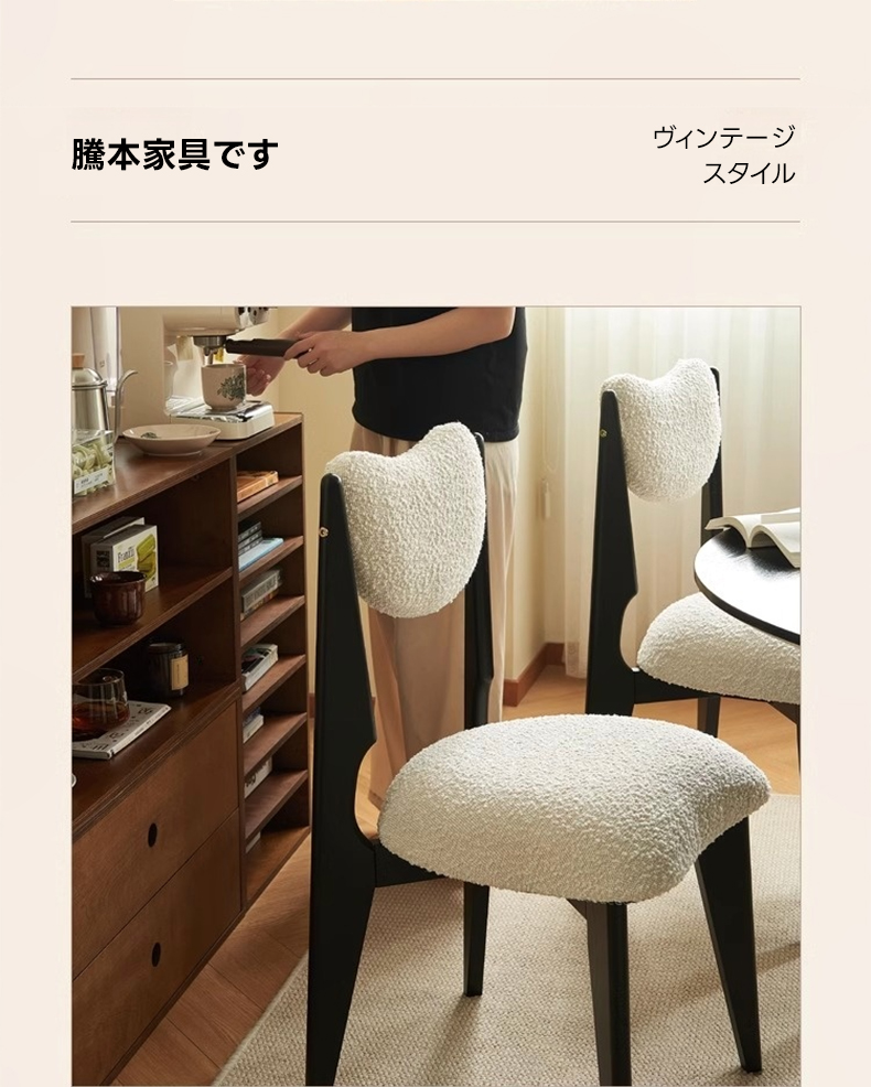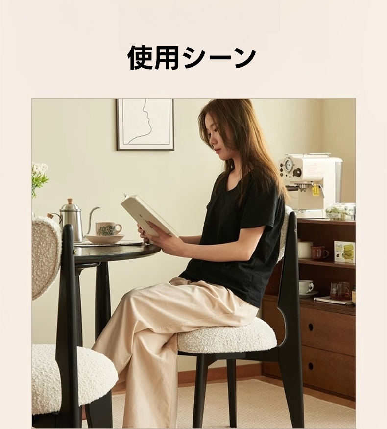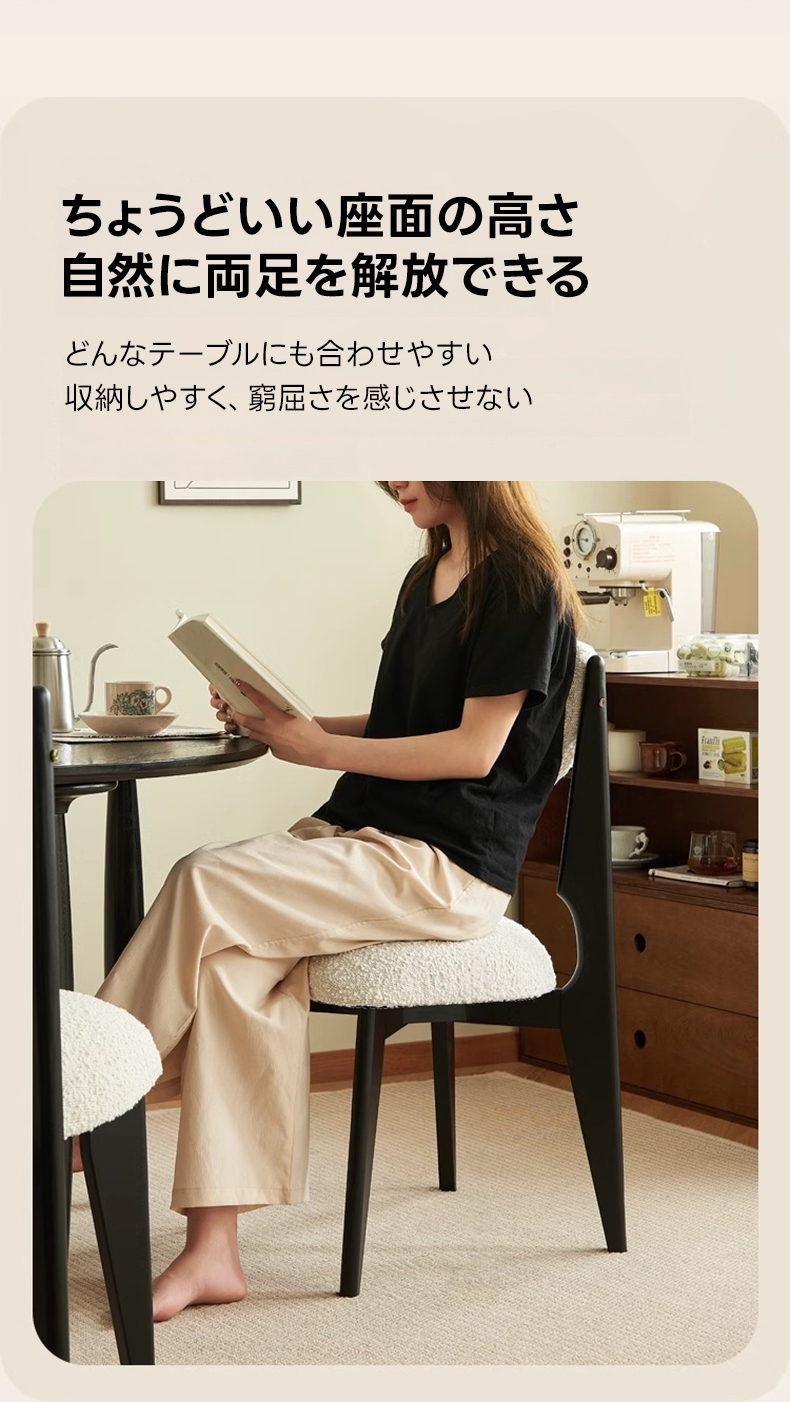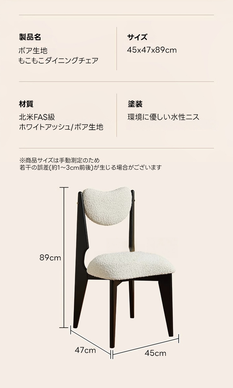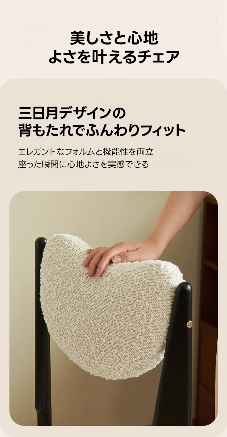 - 【高品質な素材とデザイン】:フレームには北米FAS級ホワイトアッシュを使用し、耐久性と安定感を実現。座面と背もたれには柔らかく心地よいボア生地を採用し、快適な使用感を提供します。環境に優しい水性ニス仕上げで、安心してお使いいただけます。