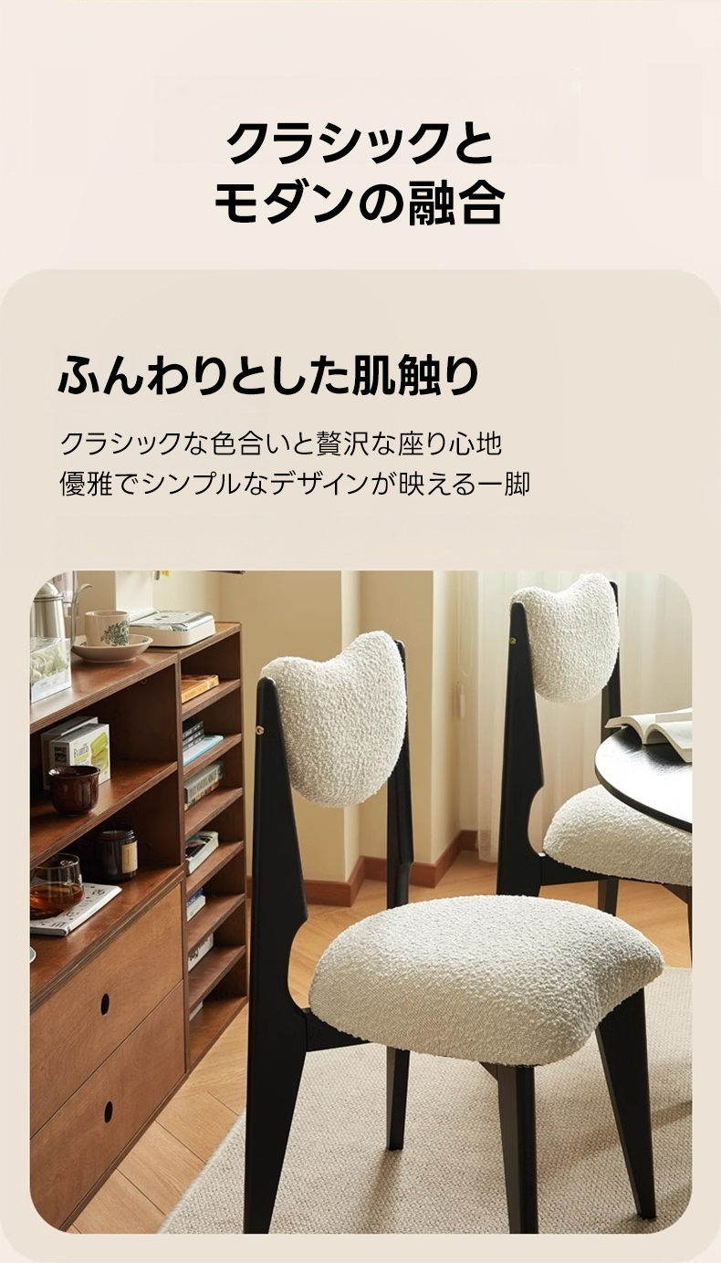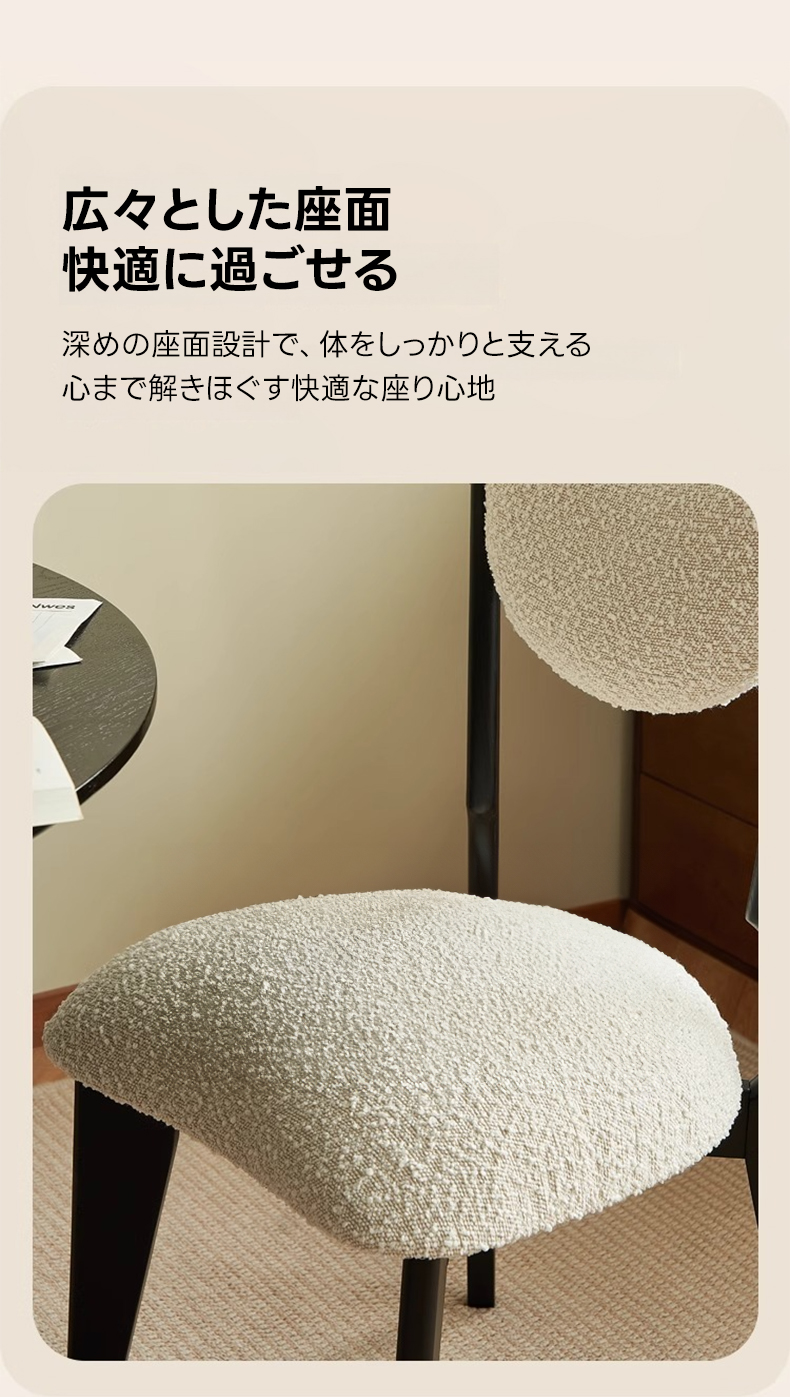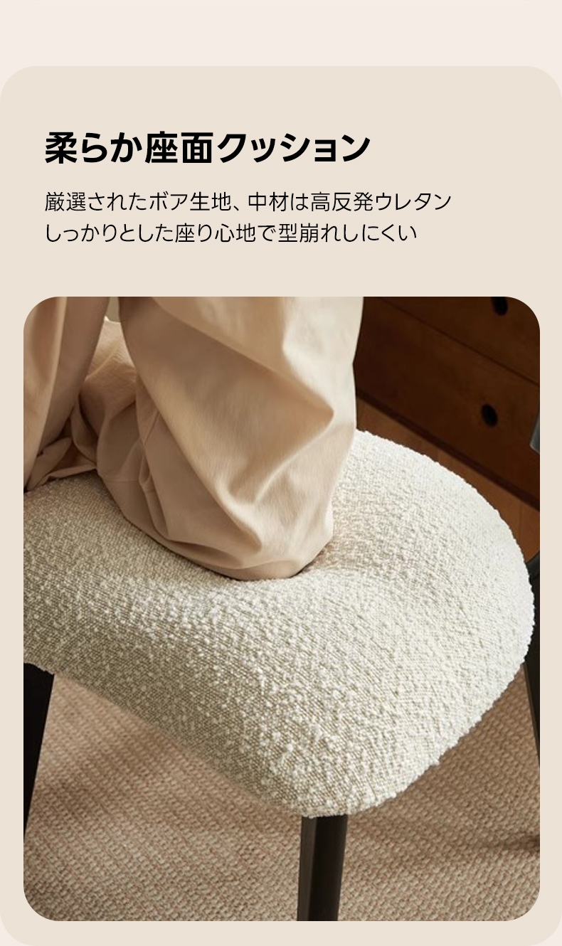 - 【快適な座り心地とサポート力】:ボア生地もこもこダイニングチェアは、広々とした座面と高反発ウレタンを採用し、長時間座っても快適な座り心地を提供します。体をしっかりと支え、どんなテーブルにも合わせやすい高さ設計で、自然な姿勢をサポートします。