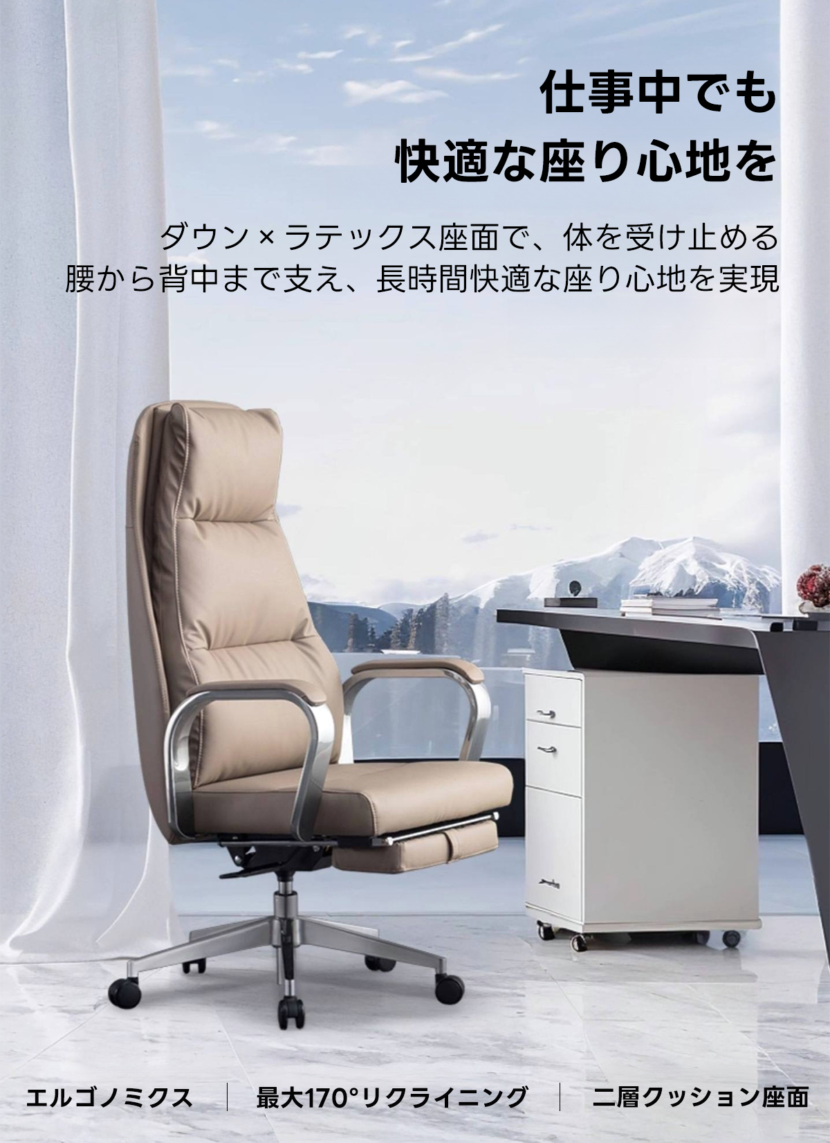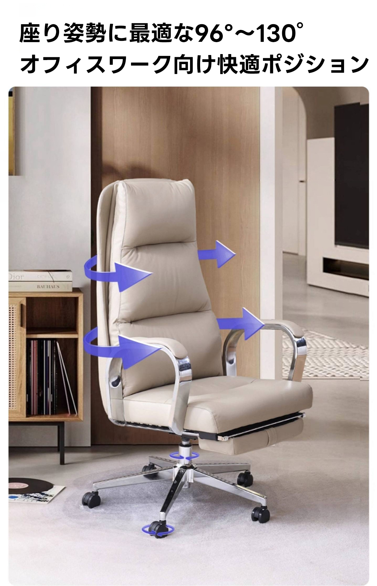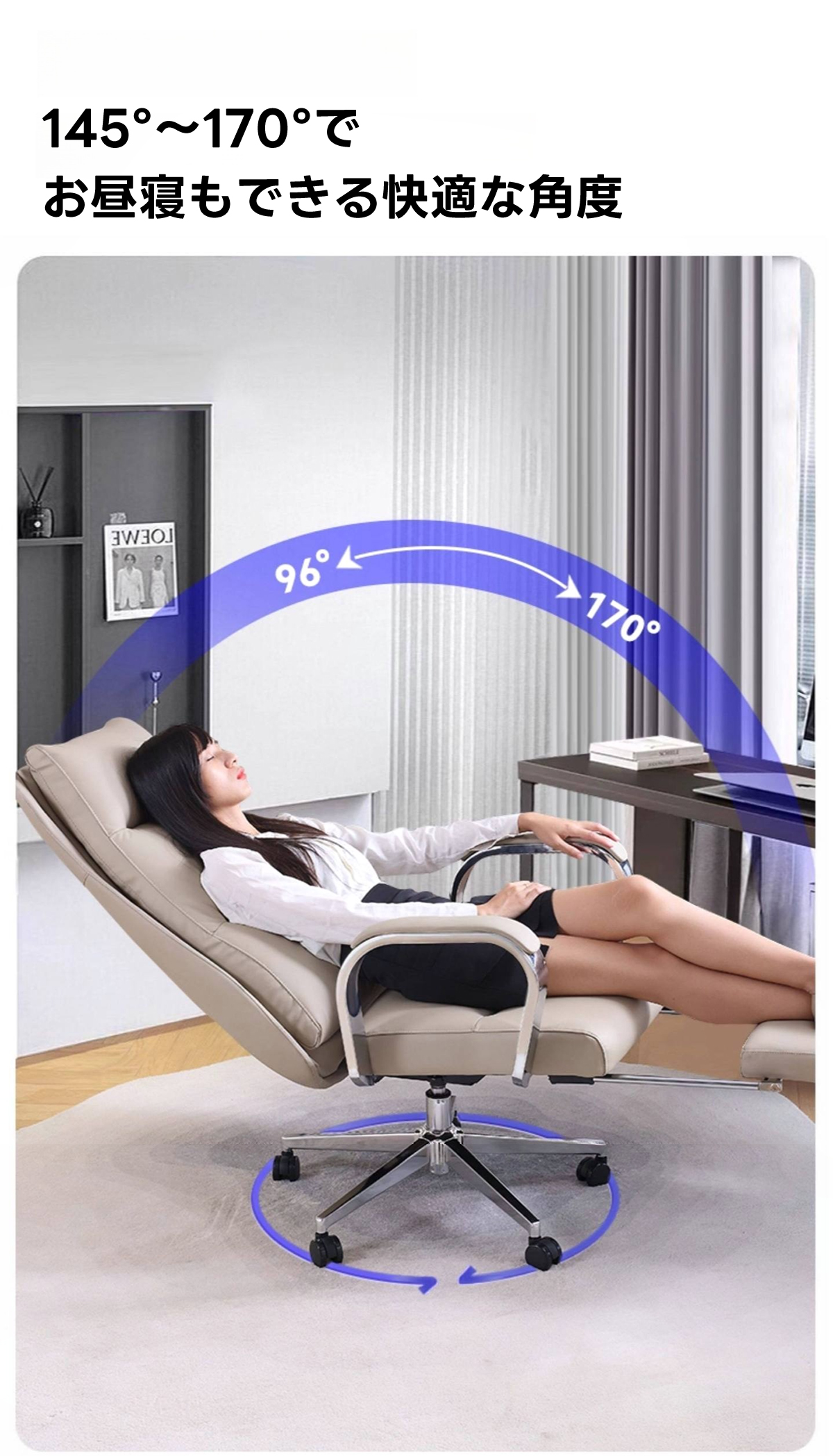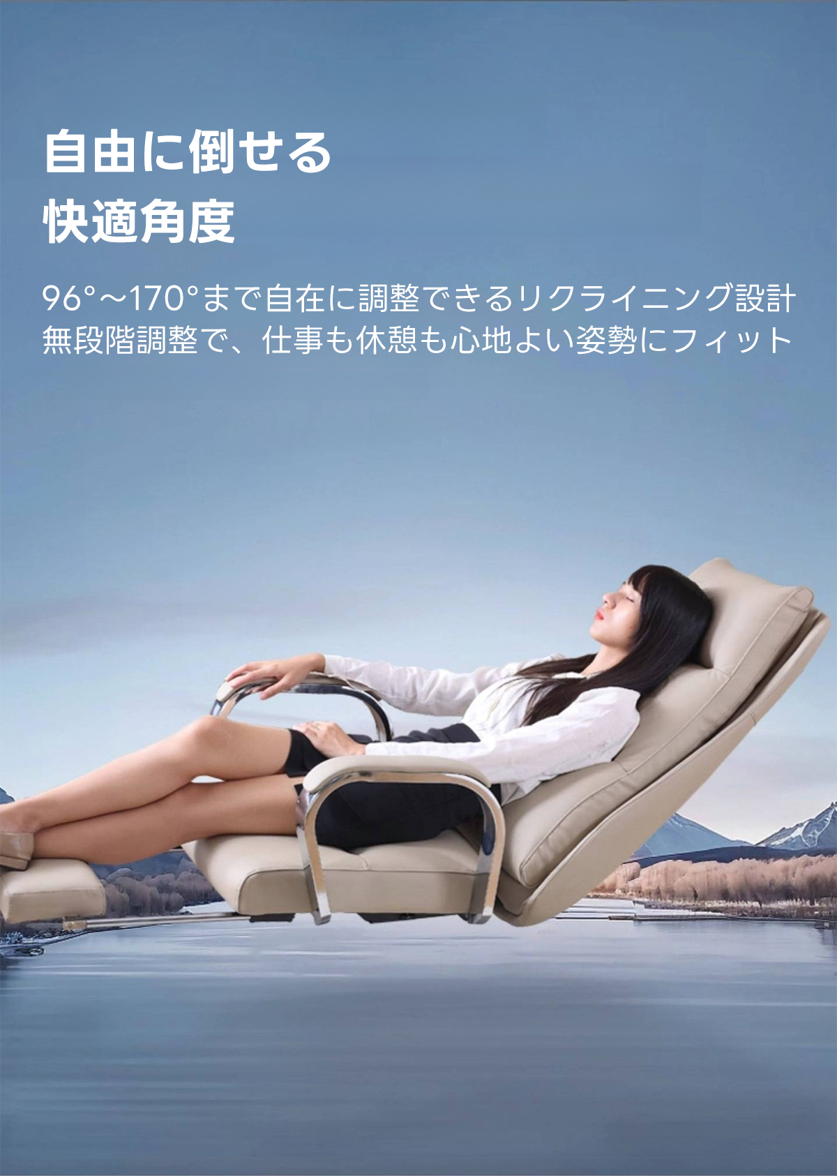 - 【多用途リクライニング機能】:96°から最大170°まで調整可能なリクライニング機能を搭載。仕事中の集中時から休憩時のリラックスまで、様々なシーンに対応します。