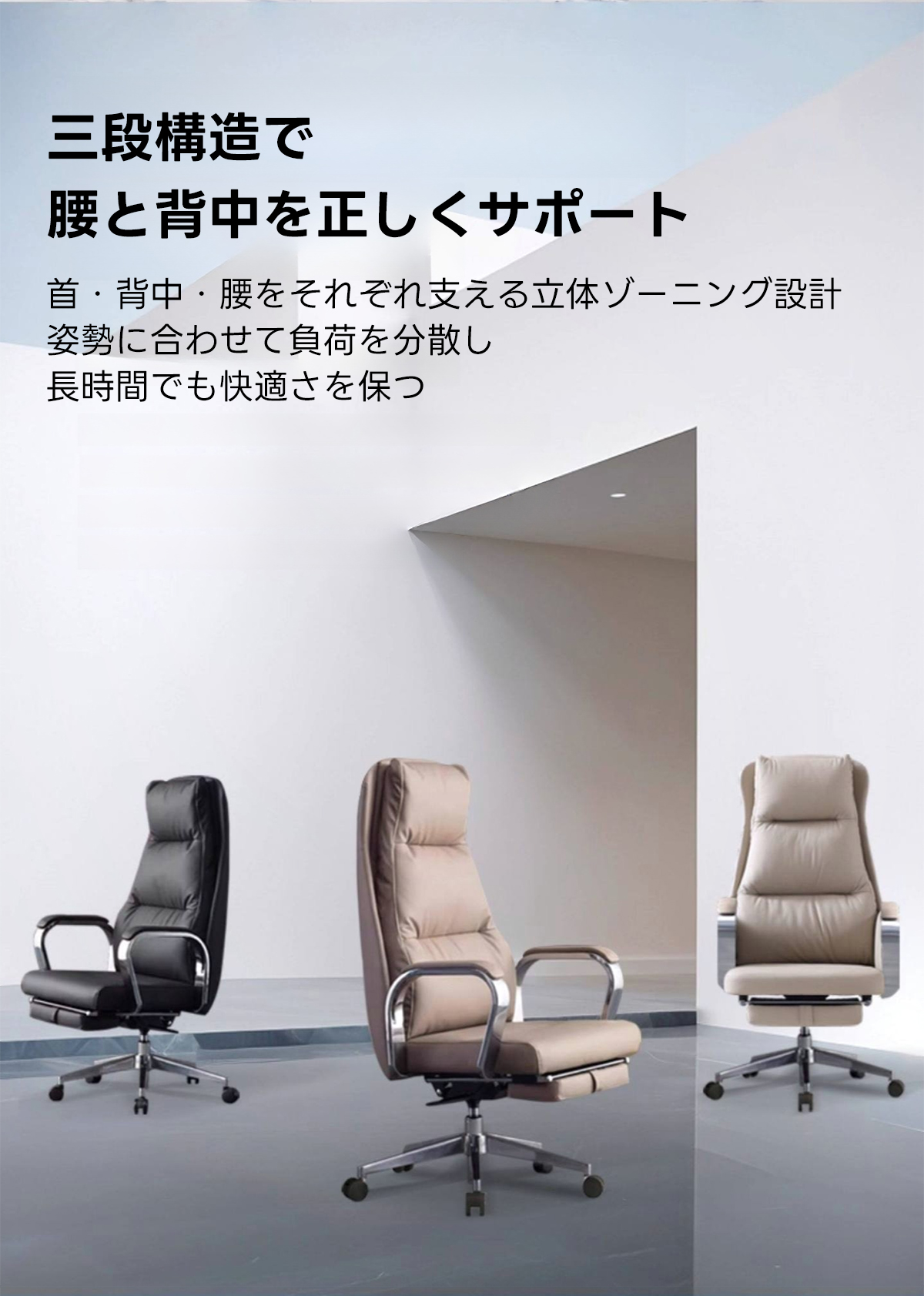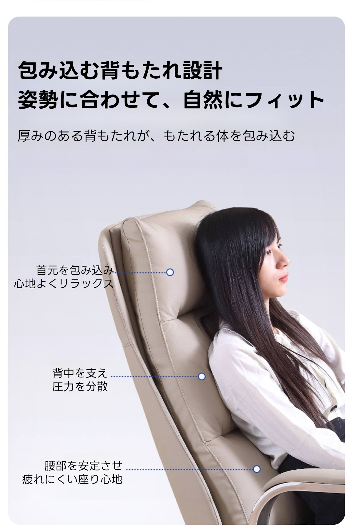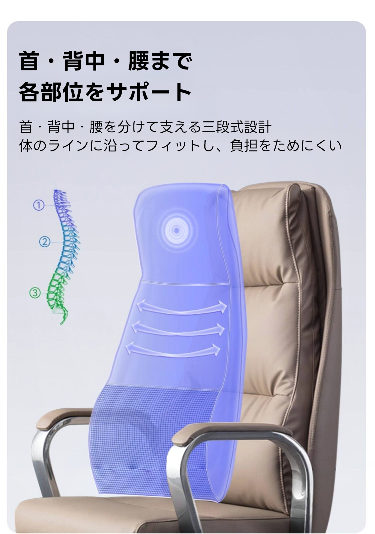 - 【エルゴノミクスデザインで快適なサポート】:首、背中、腰をしっかりと支える三段構造を採用し、長時間の使用でも疲れにくい設計です。体のラインに沿ってフィットし、負担を軽減します。