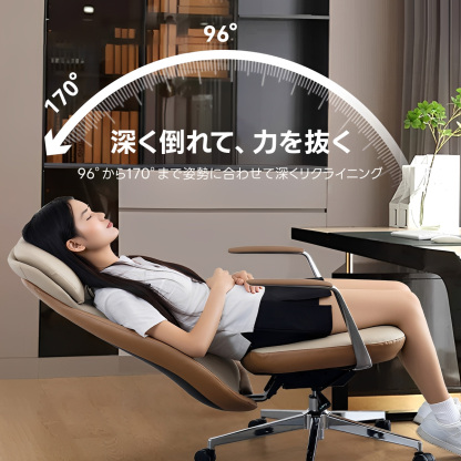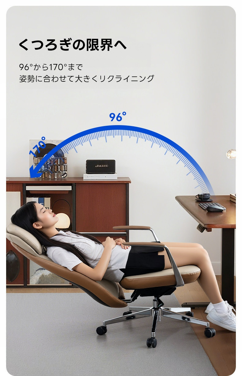 - 【ユーザーに優しい機能】調整可能なヘッドレストや96°から170°までのリクライニング機能により、作業中の姿勢からリラックスした姿勢まで自由に調整できます。静音キャスターでスムーズな移動も可能です。