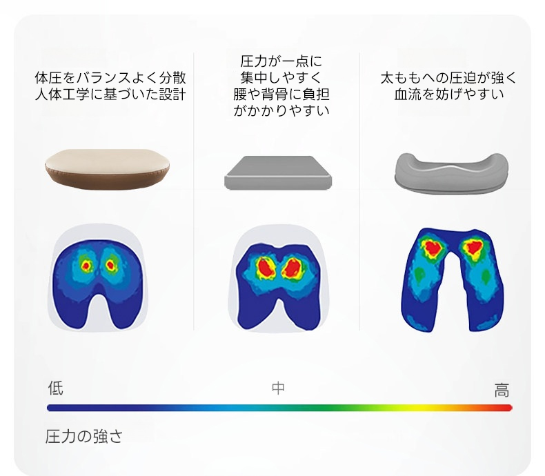 - 【エルゴノミクスデザインで快適な座り心地】人体工学に基づいた設計により、長時間の使用でも快適な座り心地を提供します。U字型の高反発座面が体圧をバランスよく分散し、腰や背骨の負担を軽減します。