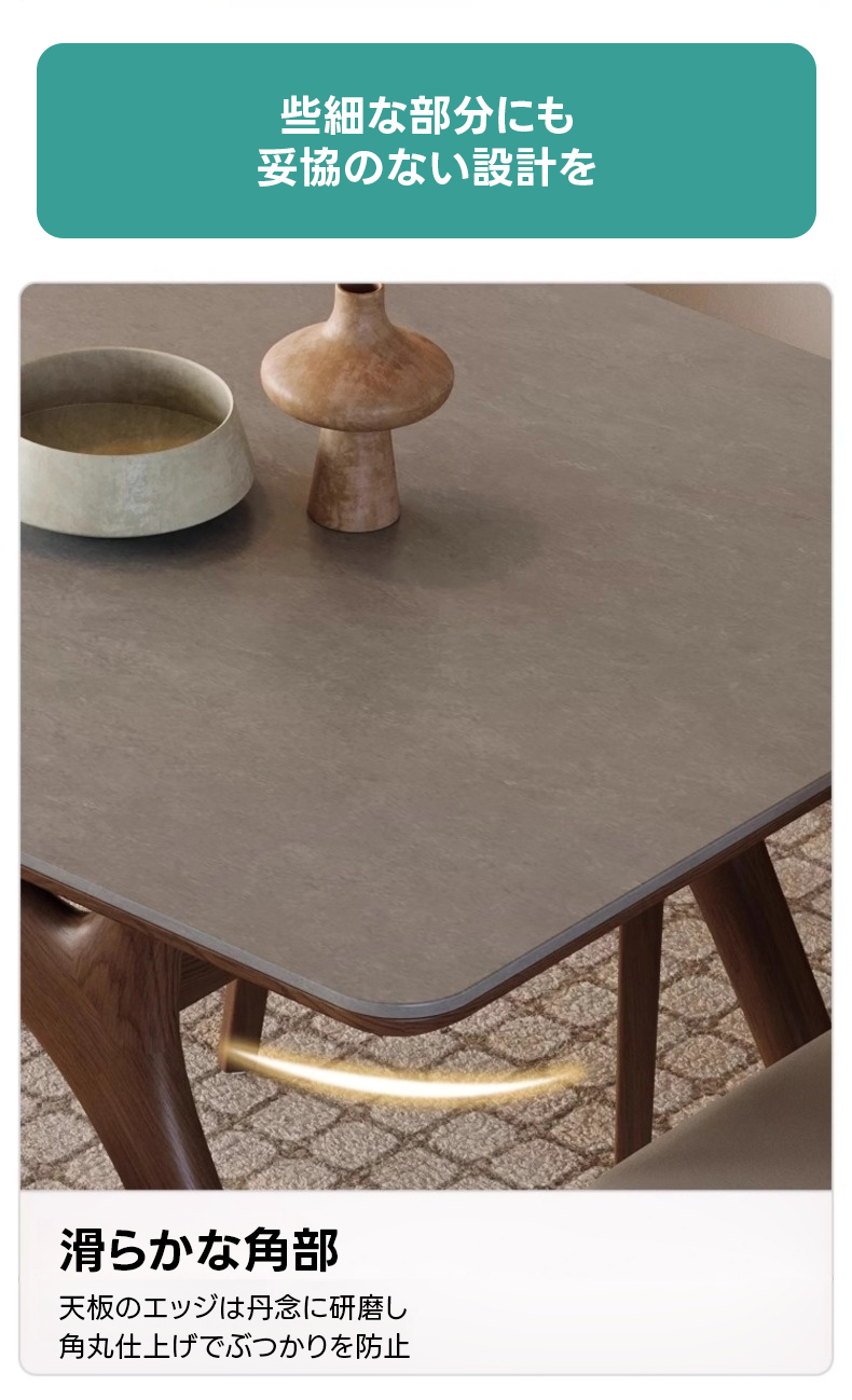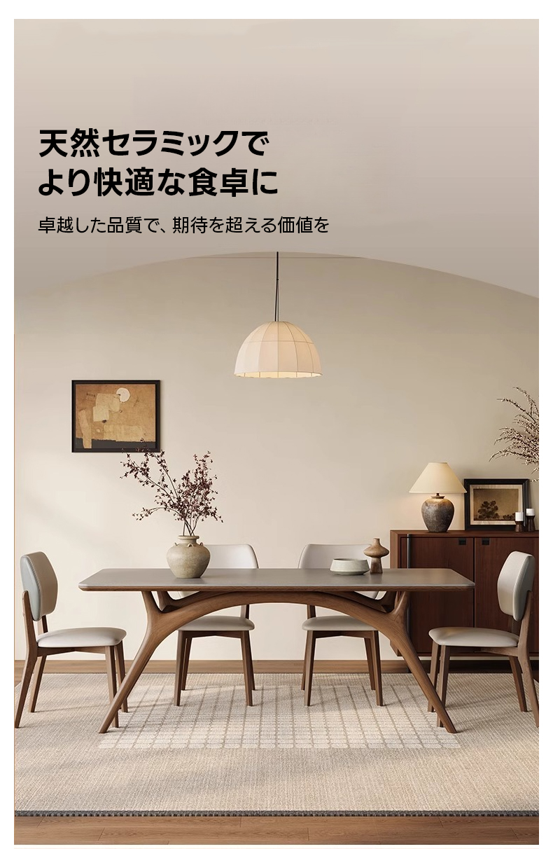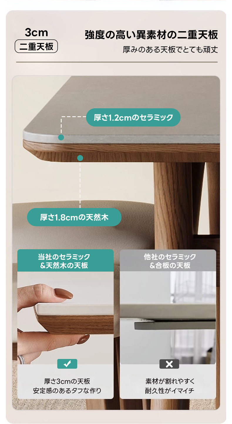 - 【高耐久性と安全性】このダイニングテーブルは、耐荷重600kgの頑丈な構造を持ち、食品グレードのセラミック天板を採用しています。モース硬度が高く、刃物を当てても傷がつきにくい設計です。また、2000℃までの耐熱性を備えており、熱々の鍋を直接置いても問題ありません。