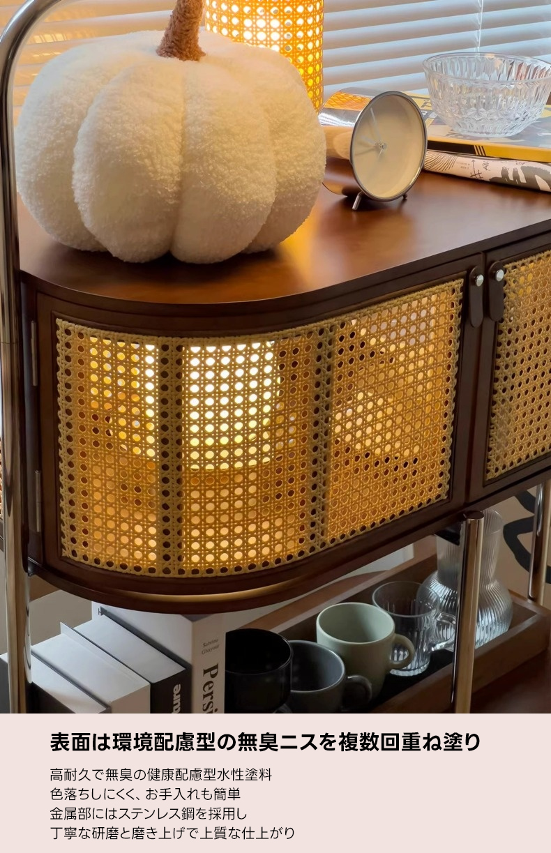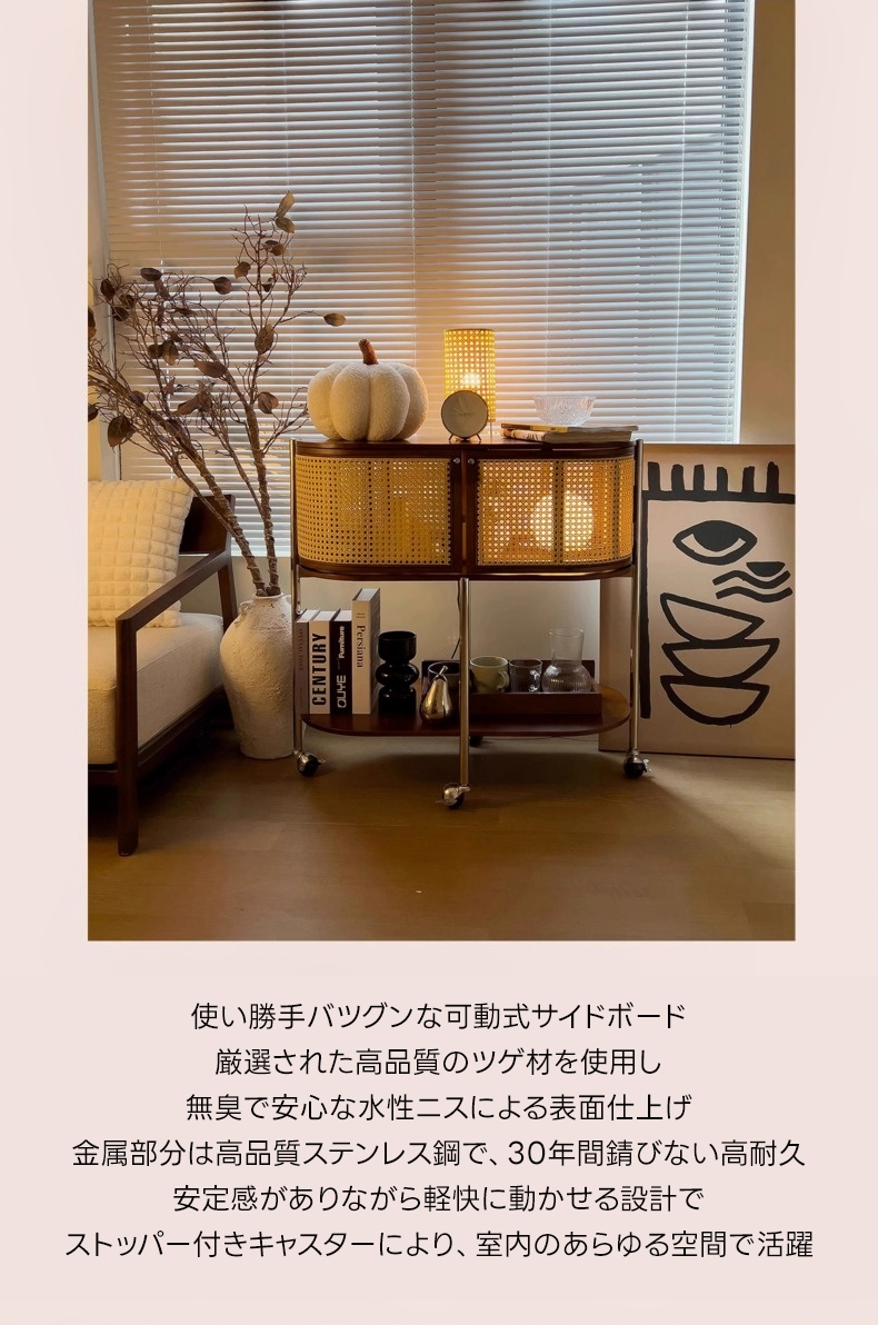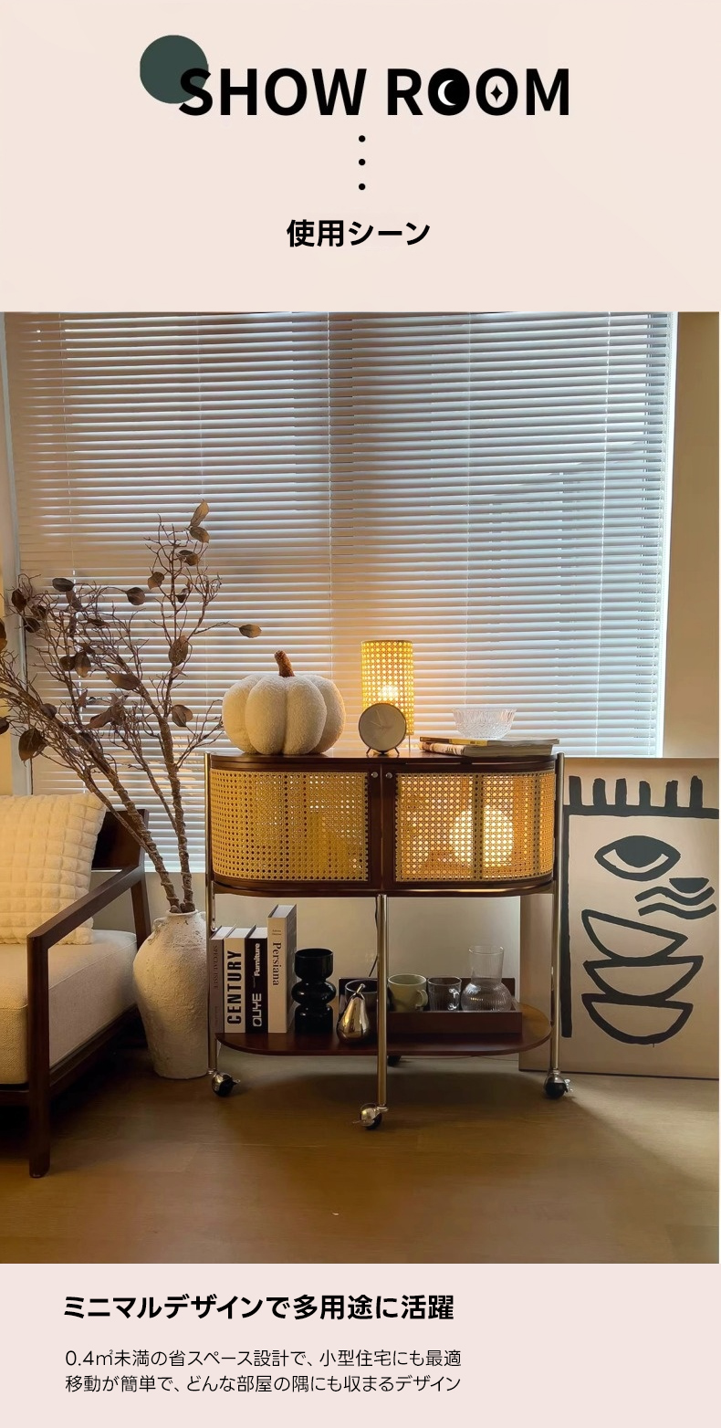 - 【移動が簡単なキャスター付き】:ラタン編みサイドボードはキャスター付きで、ストッパー機能も備えているため、リビングや寝室、キッチンなどどの部屋にも簡単に移動できます。家具の配置替えや掃除の際にも便利です。