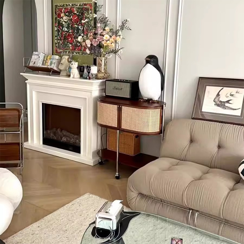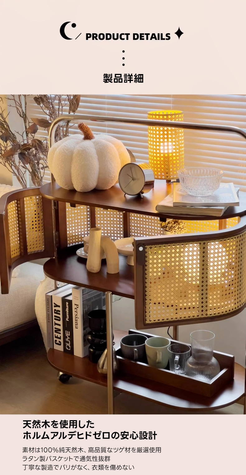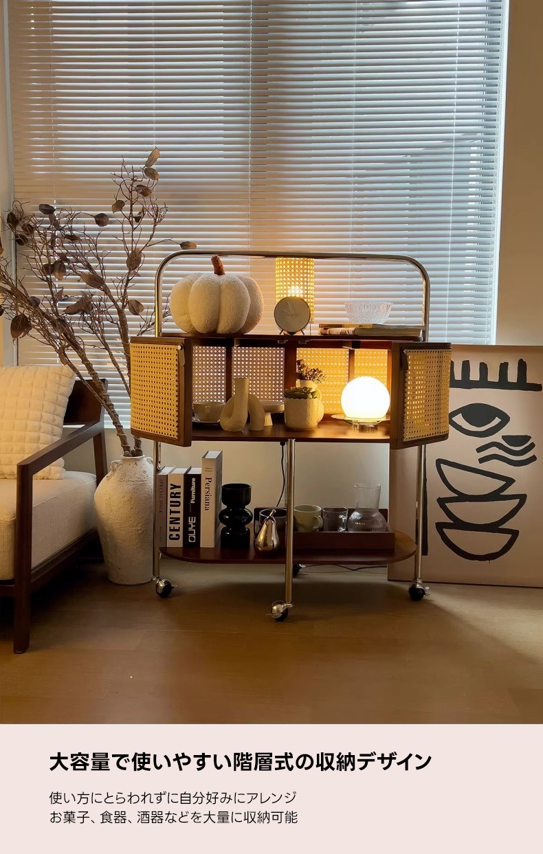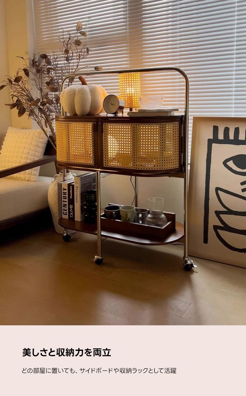 - 【移動が簡単なキャスター付き】:ラタン編みサイドボードはキャスター付きで、ストッパー機能も備えているため、リビングや寝室、キッチンなどどの部屋にも簡単に移動できます。家具の配置替えや掃除の際にも便利です。