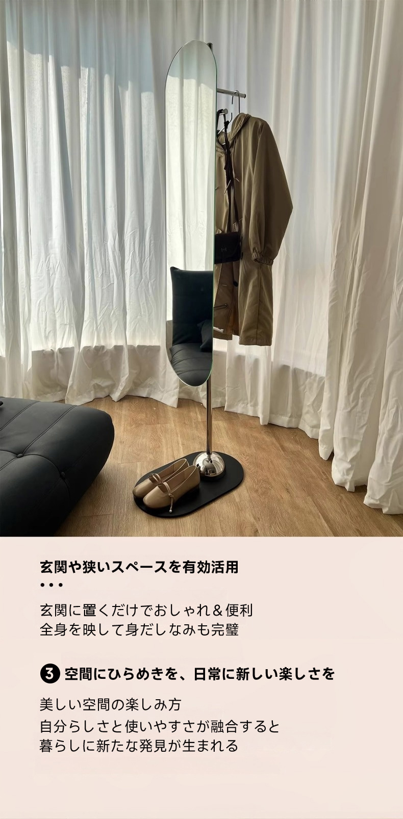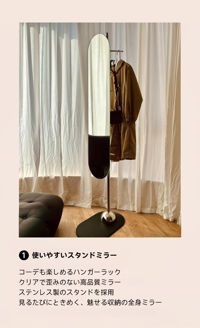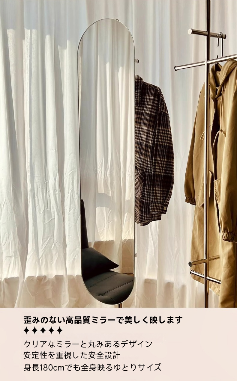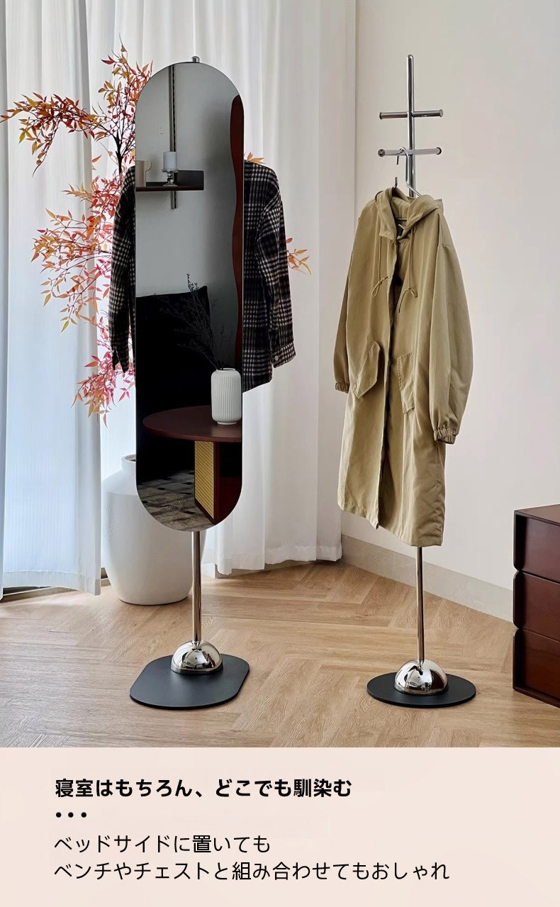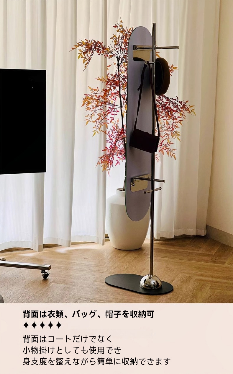 - 【多機能スタンドミラー】エレガントスタンドミラーは、オーバル型の不規則デザインで、どんなインテリアにも馴染む多機能ミラーです。全身をしっかりと映し出し、背面にはコートやバッグを掛けられるラックを備えています。