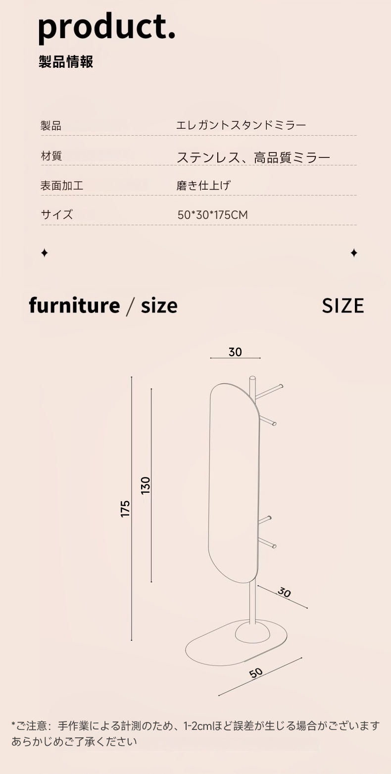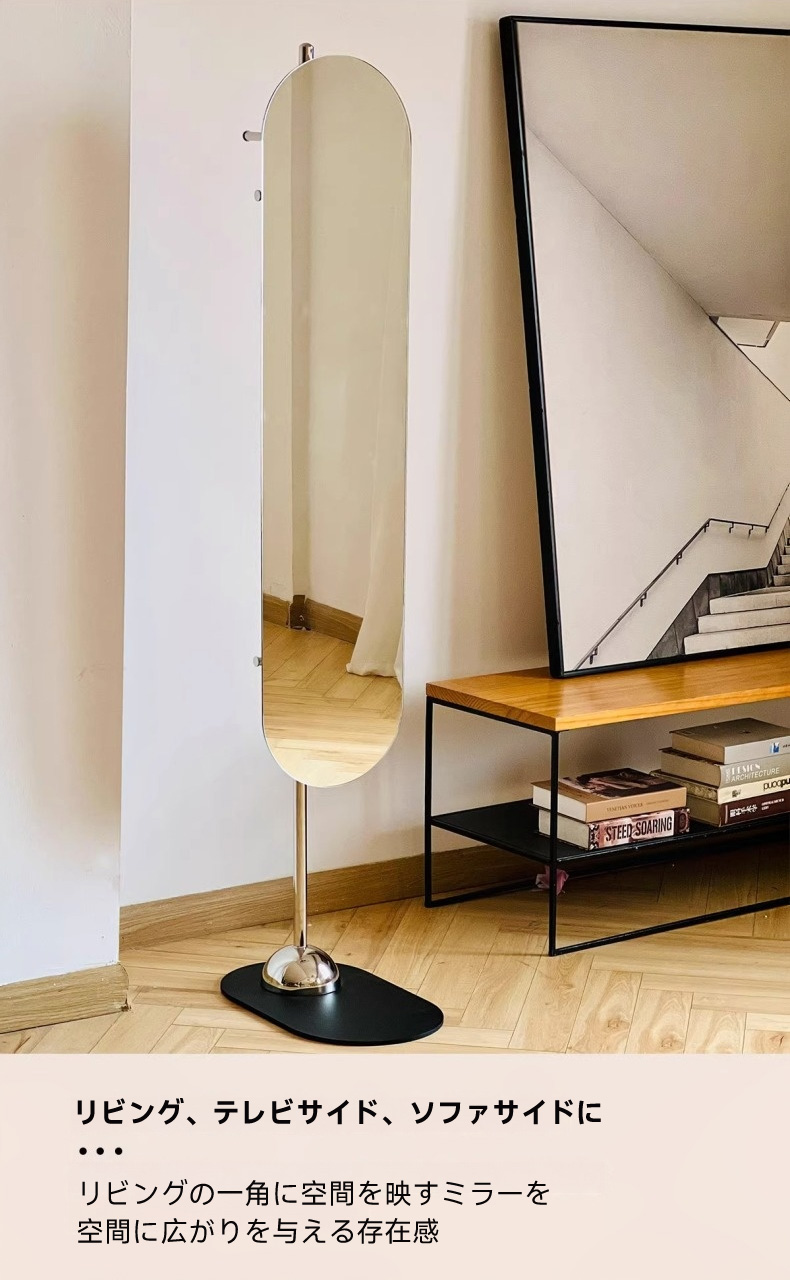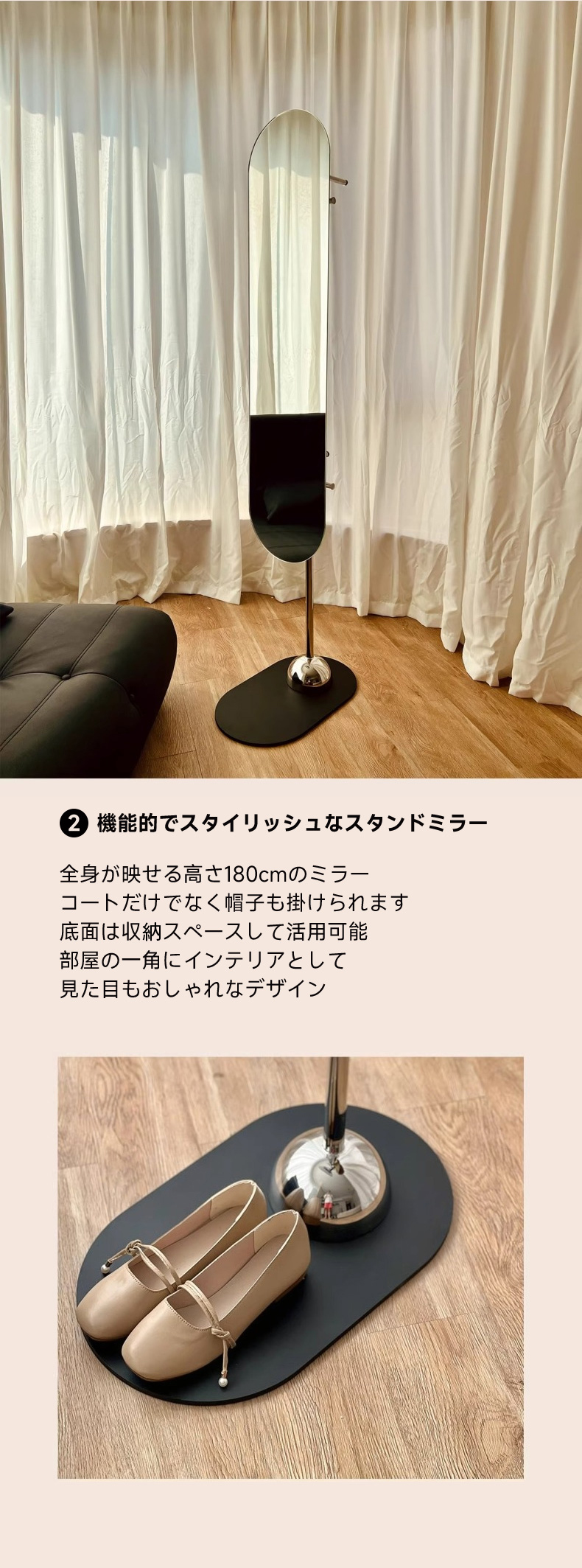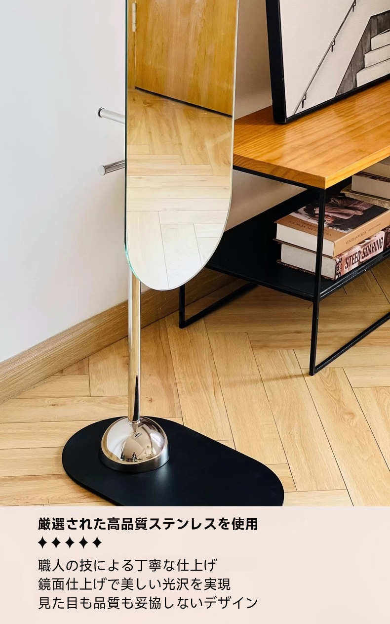 - 【多機能スタンドミラー】エレガントスタンドミラーは、オーバル型の不規則デザインで、どんなインテリアにも馴染む多機能ミラーです。全身をしっかりと映し出し、背面にはコートやバッグを掛けられるラックを備えています。