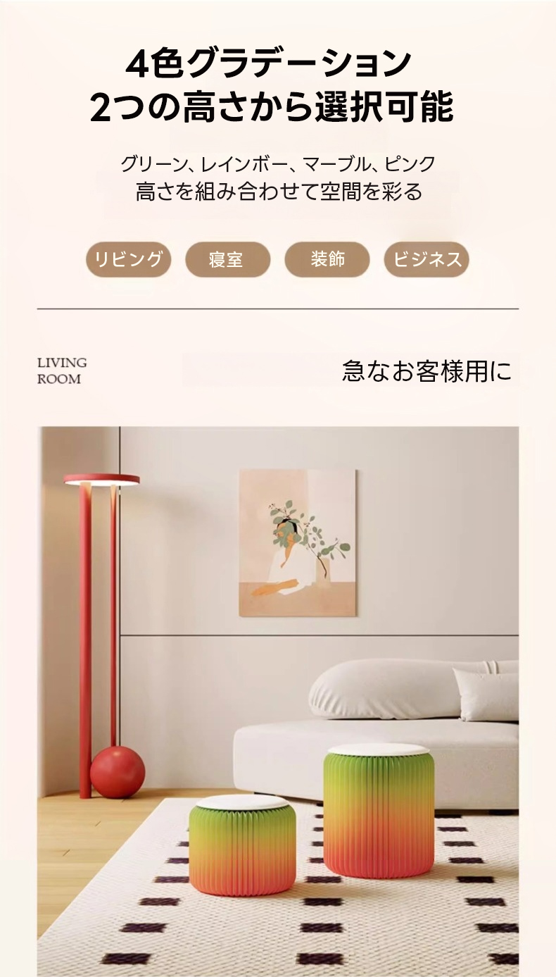 - 【多用途で便利なスツール】ピンク、グリーン、レインボー、マーブルの4色から選べ、2つの異なる高さで空間を彩ります。リビング、寝室、オフィスなど、様々なシーンで活躍し、カップルやファミリー、一人暮らしの方にもおすすめです。