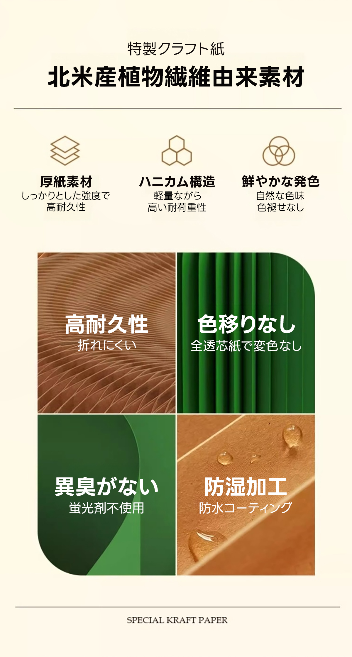 - 【高品質な素材とデザイン】:北米産植物繊維由来のクラフト紙を使用し、環境に優しい製品です。側板にはPUレザーを使用し、滑らかで上質な仕上がりを提供します。エコ素材でありながら高級感を演出します。