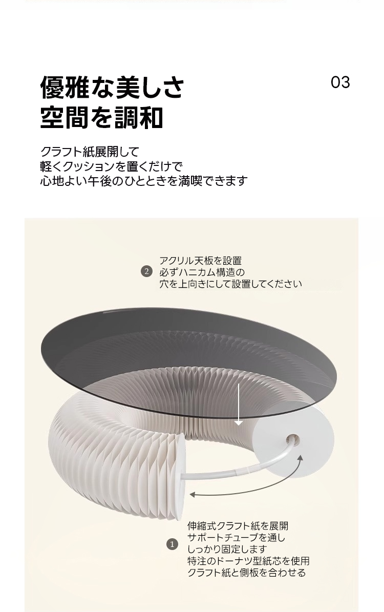 - 【高品質な素材と構造】ハニカム構造のクラフト紙を使用し、アクリル天板が透明感と安定感を提供。環境に配慮した植物由来の接着剤を使用し、FSC認証を取得しています。