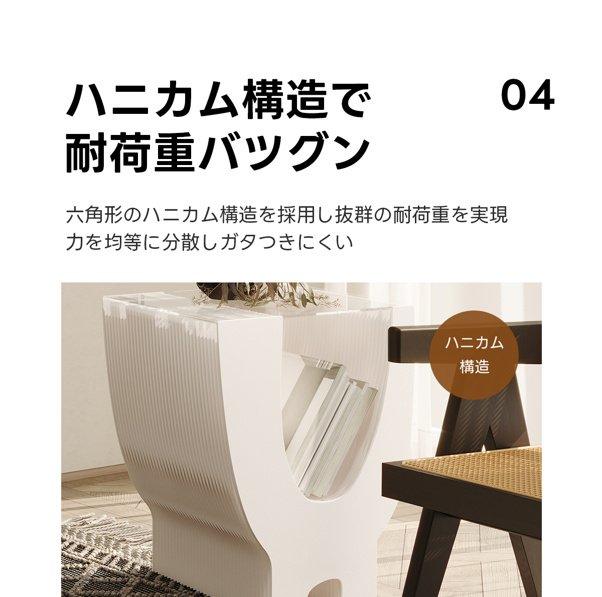 - 【ハニカム構造で安定性抜群】六角形のハニカム構造を採用し、優れた耐荷重を実現。力を均等に分散するため、安定感がありガタつきにくい設計です。安心してご使用いただけます。