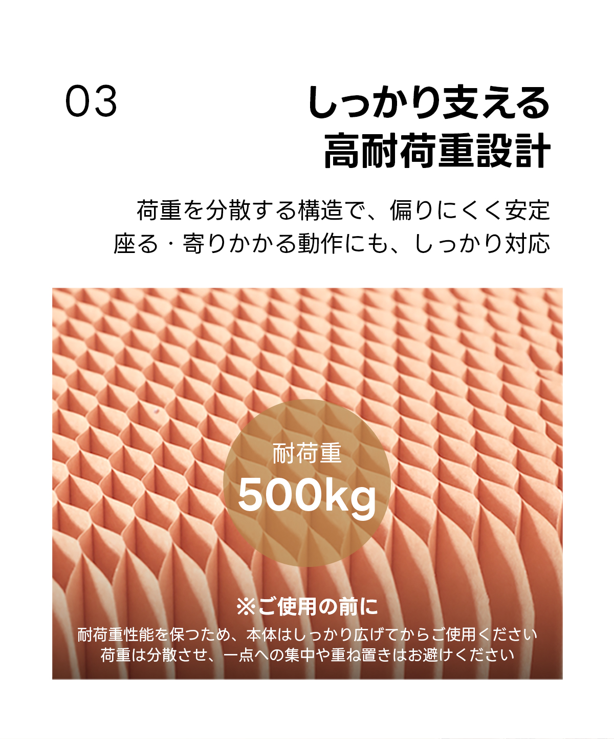 - 【高品質な素材と構造】北米産植物繊維由来の特製クラフト紙を使用し、軽量ながらも500kgまでの荷重に耐える高い耐荷重性を実現。ハニカム構造により、強度を保ちながらも軽量化を実現し、安定した使用感を提供します。