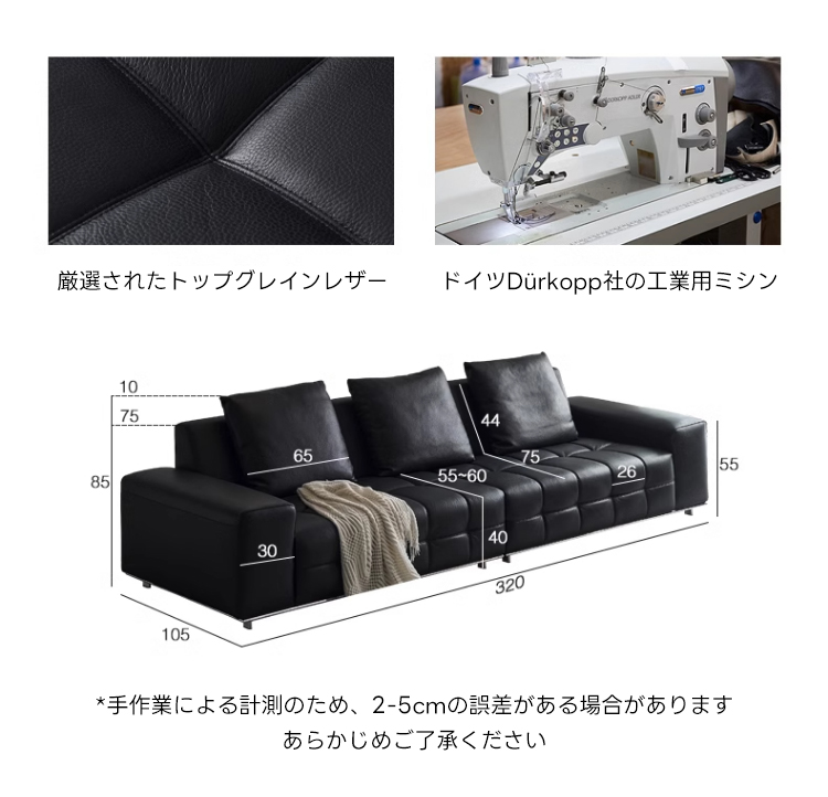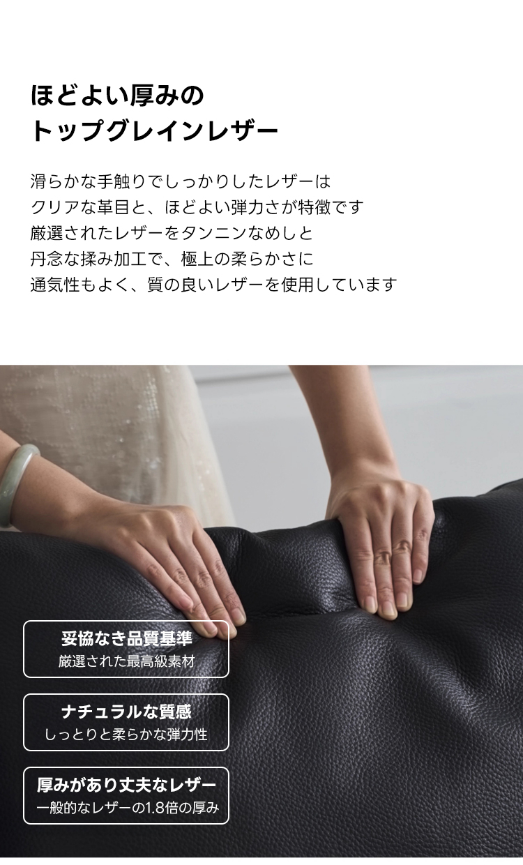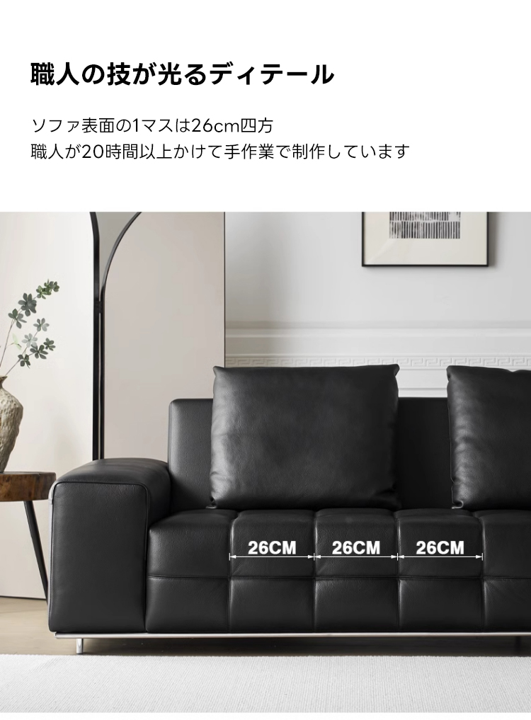 - 【職人技が光るディテール】:ドイツ製のミシンを用いたダブルステッチ技術により、細部まで丁寧に仕上げられています。見た目の美しさと耐久性を兼ね備え、上質な暮らしをサポートします。