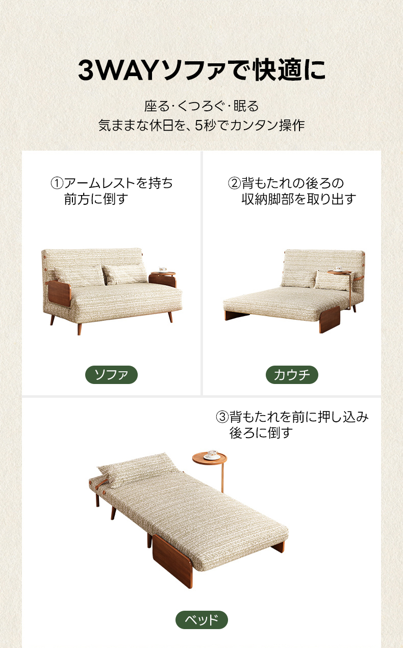 - 【多機能デザインで快適な生活】:このソファベッドは、ソファ、カウチ、ベッドの3WAYで使用可能です。わずか5秒で簡単に切り替えられ、リビングやゲストルームでの使用に最適です。多機能設計により、日常生活の利便性を大幅に向上させます。