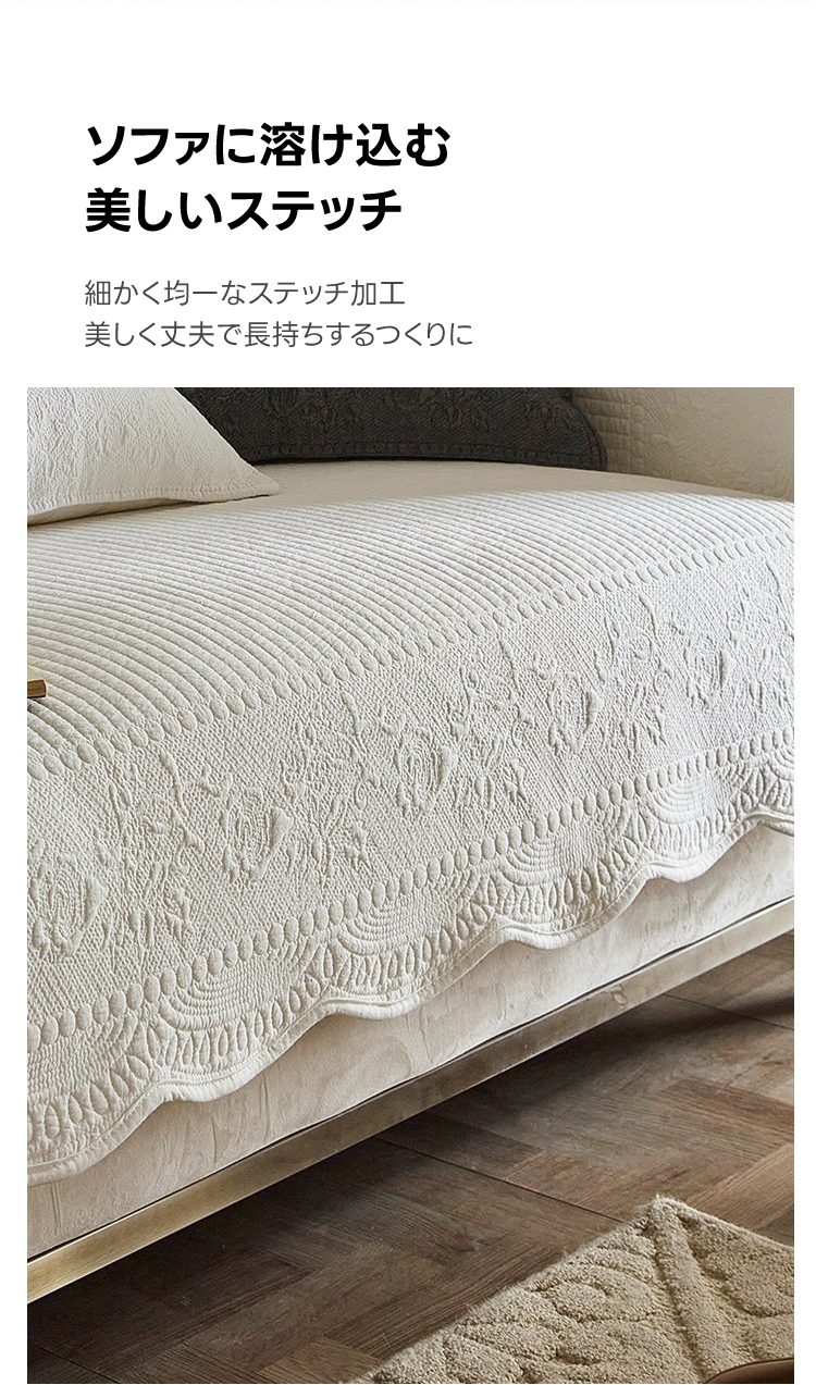 - 【快適な使用体験と価値】カバーの裏面全体に滑り止めが付いており、ズレを防止します。ホワイトとベージュの2色展開で、ナチュラルなインテリアに合わせやすいカラーです。幅70cmから110cm、奥行き70cmから240cmまでのサイズがあり、様々なソファにフィットします。