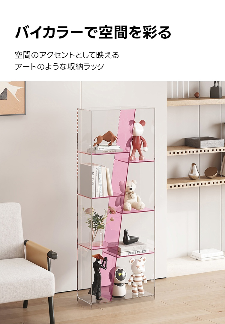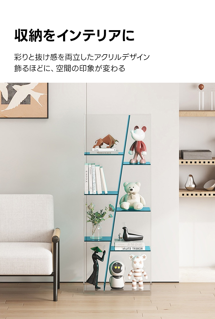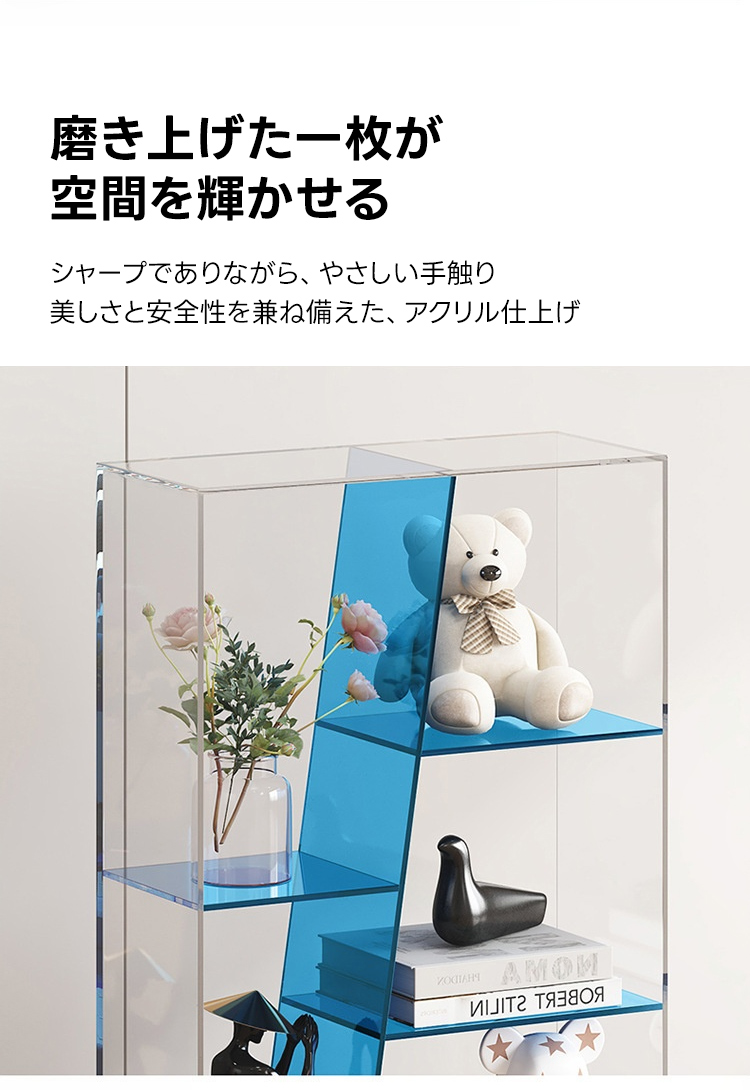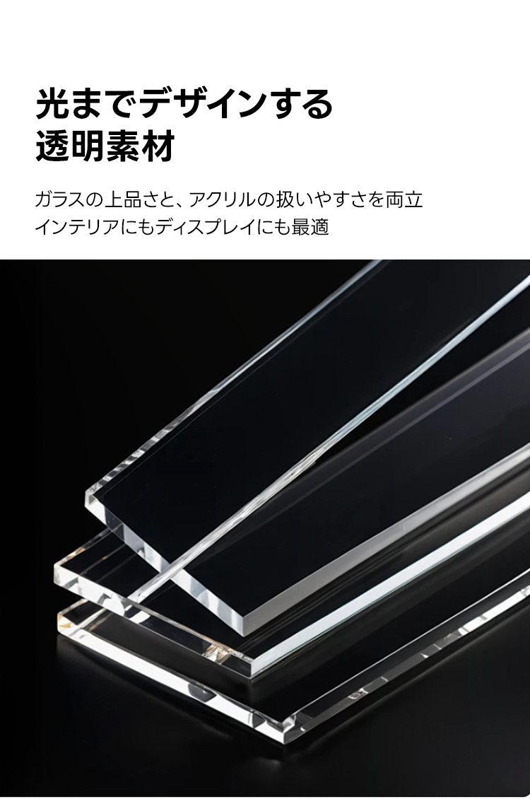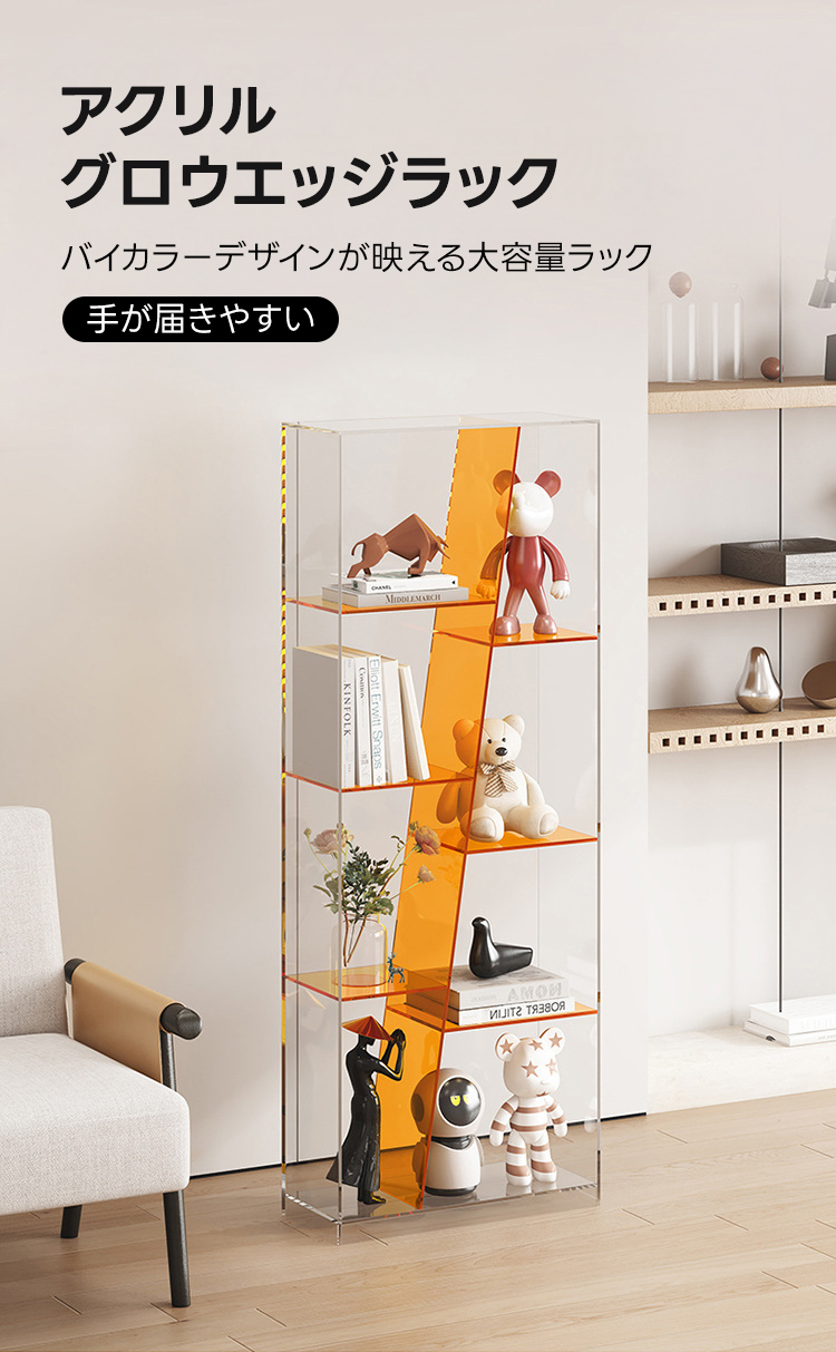 - 【多機能収納ラック】:アクリル グロウエッジラックは、モダンでスタイリッシュなデザインが特徴の収納家具です。高透明度のアクリル素材を使用し、光を通すことで空間を明るく見せる効果があります。書籍や小物を美しくディスプレイしながら収納できる大容量設計です。
