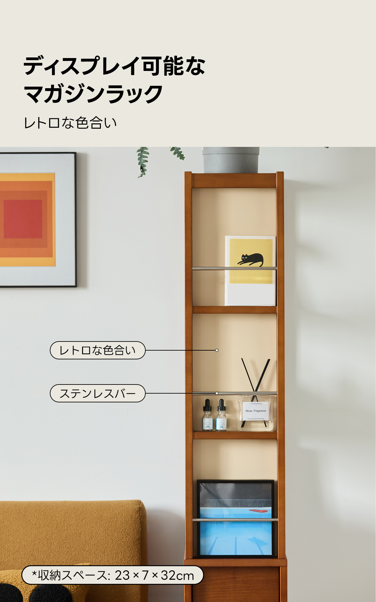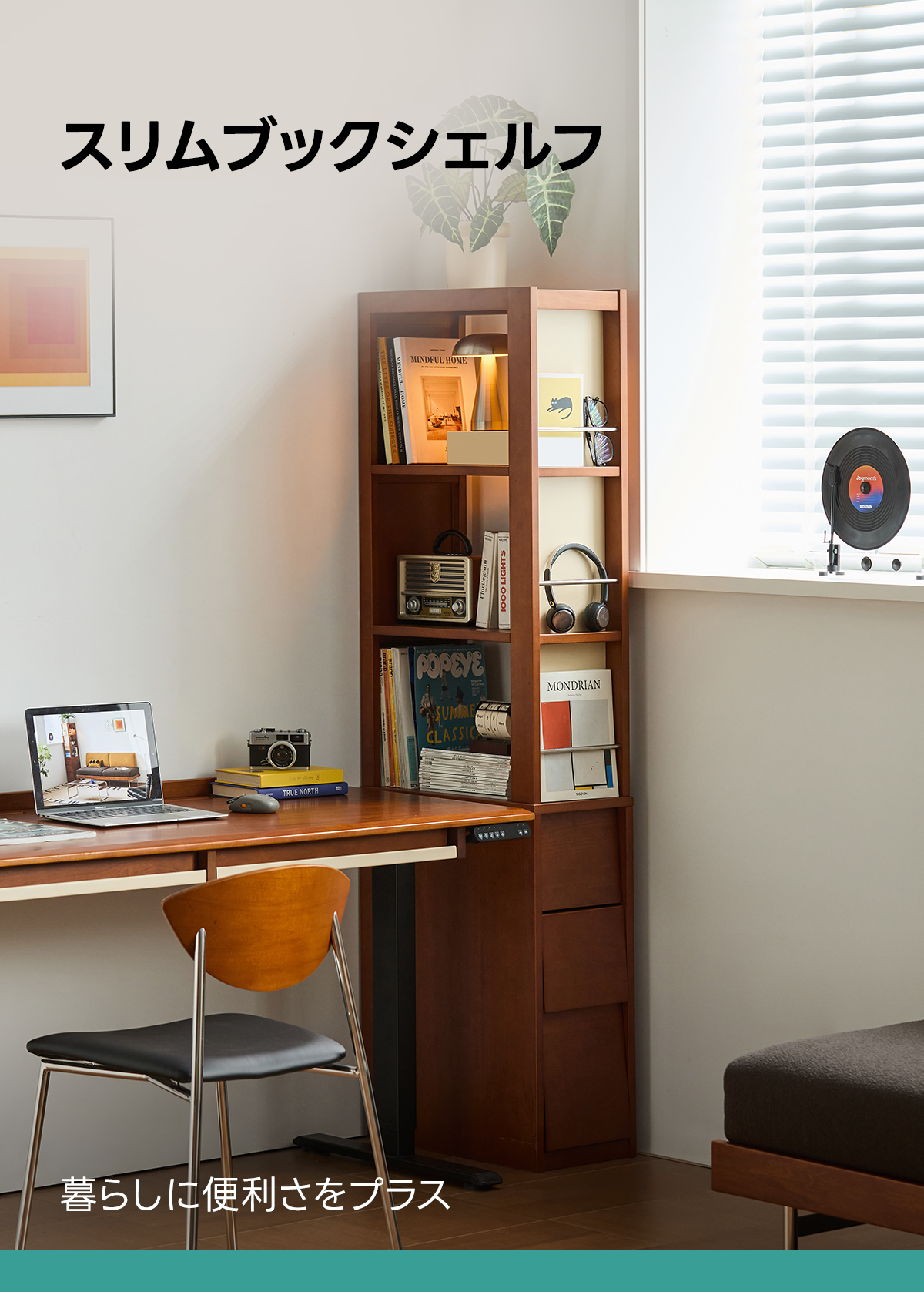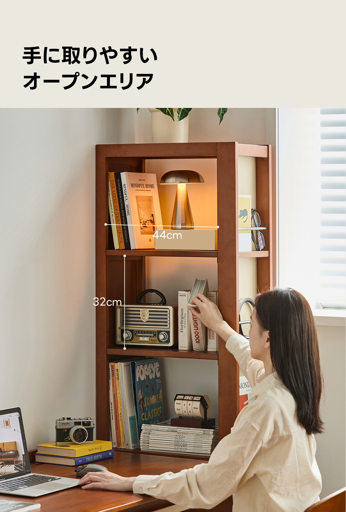 - 【豊富な収納エリア】:スリムブックシェルフは、オープンエリア、マガジンラック、小物エリア、大容量エリアに分かれた豊富な収納スペースを提供します。限られたスペースを有効活用できる設計で、書斎やホームオフィスに最適です。