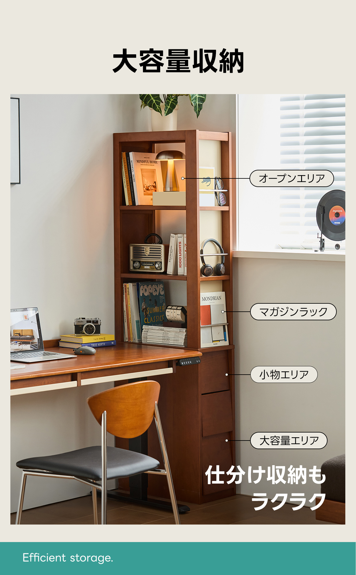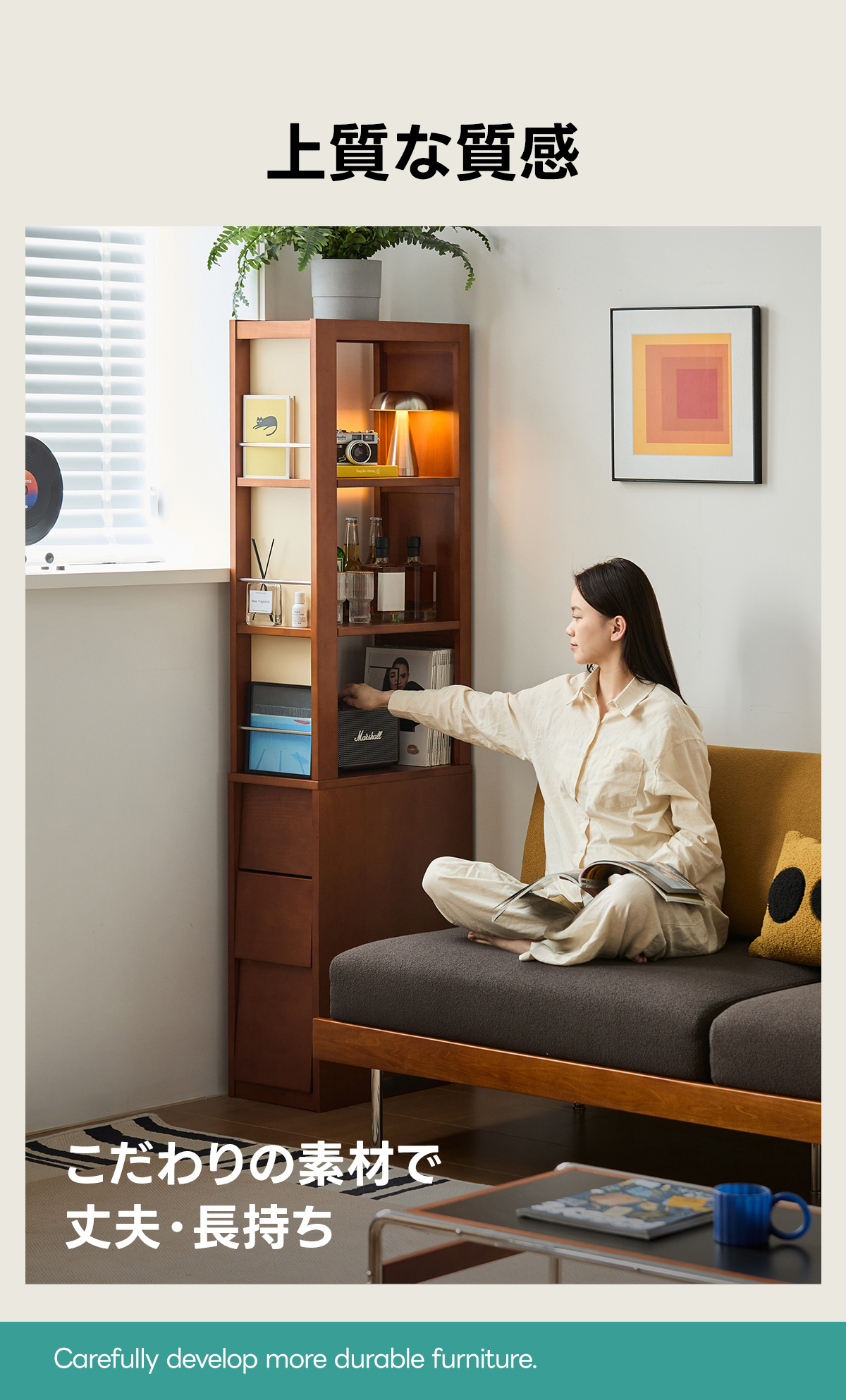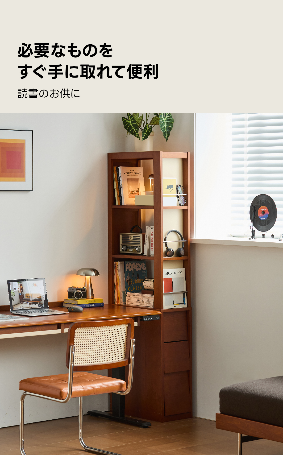 - 【豊富な収納エリア】:スリムブックシェルフは、オープンエリア、マガジンラック、小物エリア、大容量エリアに分かれた豊富な収納スペースを提供します。限られたスペースを有効活用できる設計で、書斎やホームオフィスに最適です。