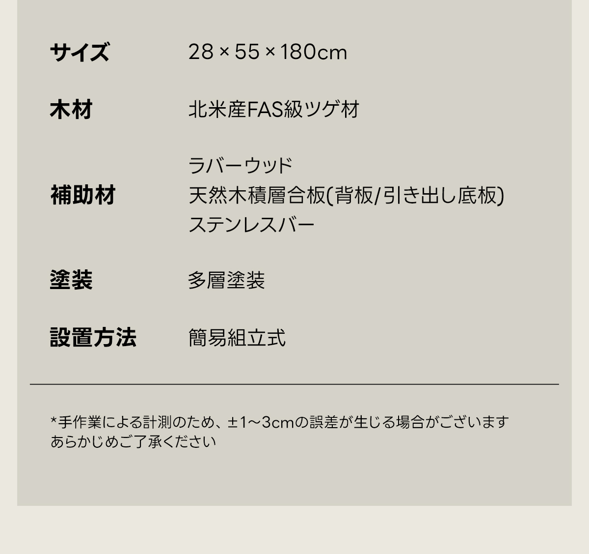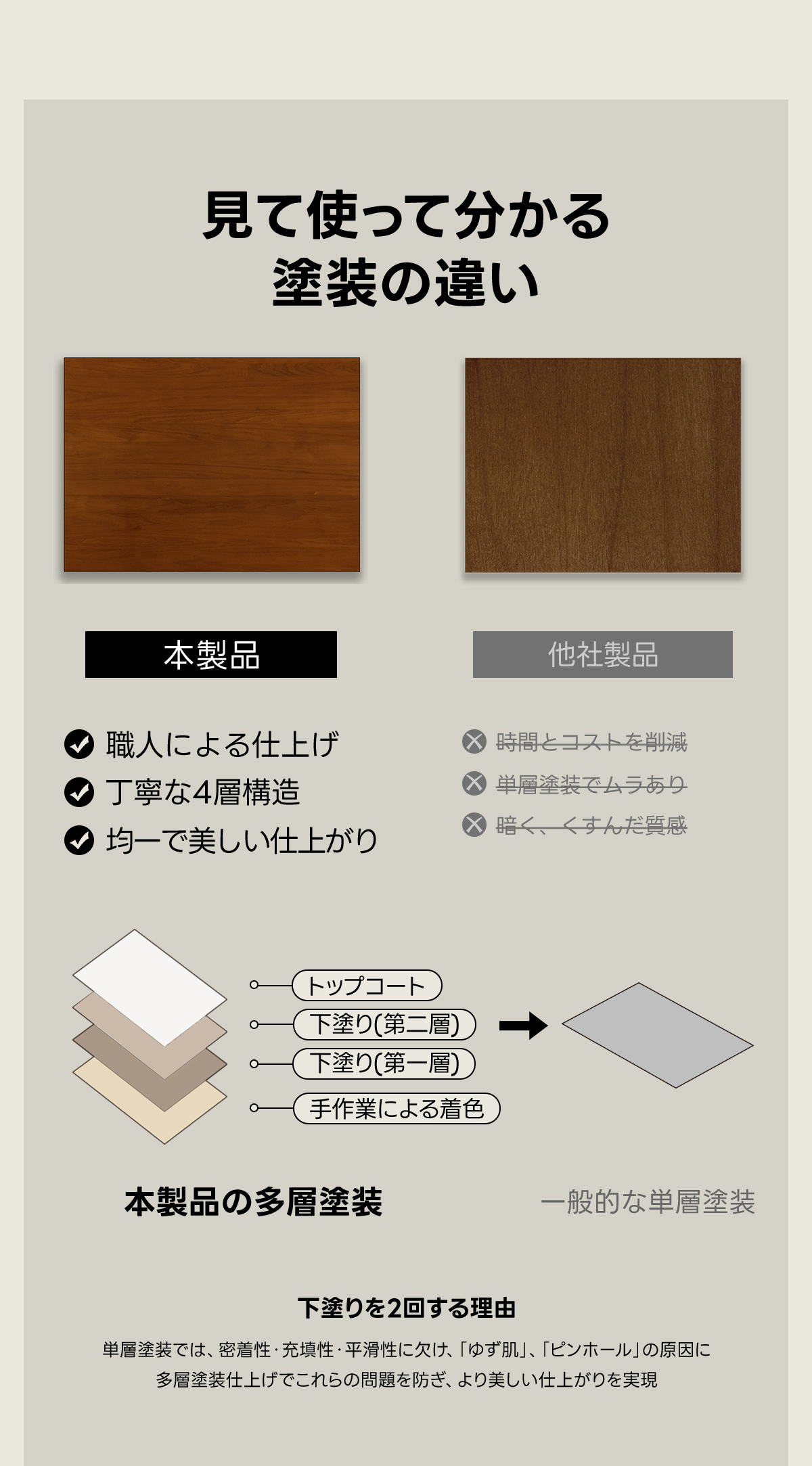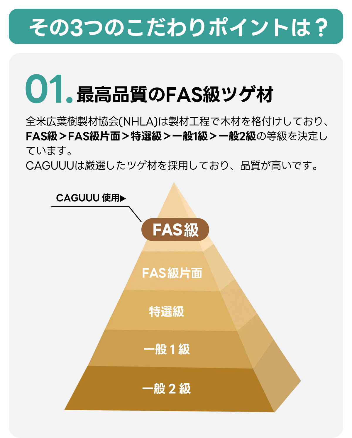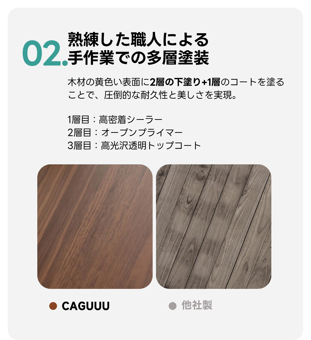 - 【高級木材使用】:北米産FAS級ツゲ材を使用し、耐久性と美しさを兼ね備えています。多層塗装による丁寧な仕上げが施され、上質な質感を楽しむことができます。