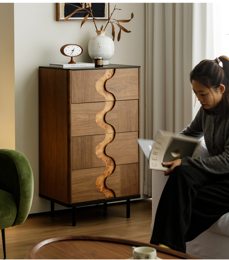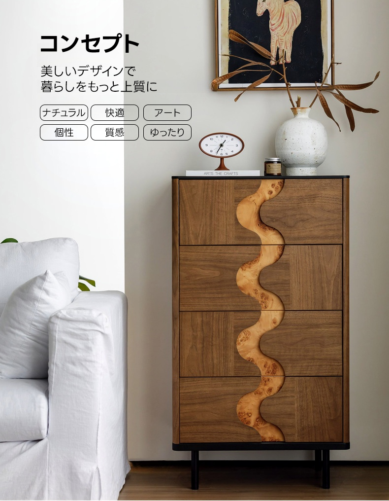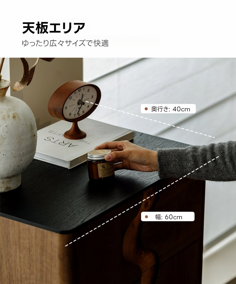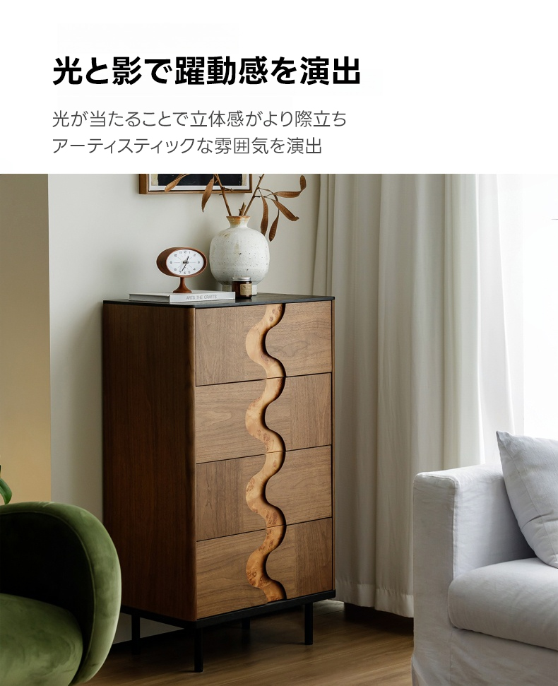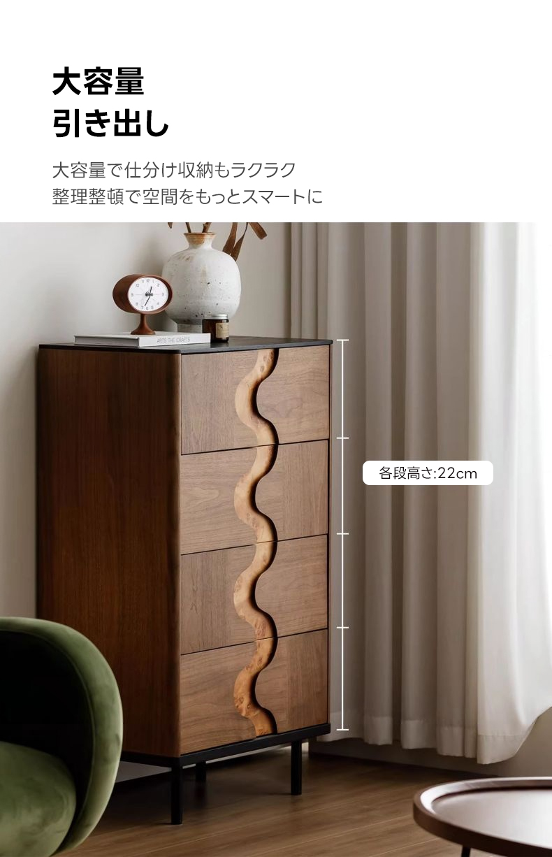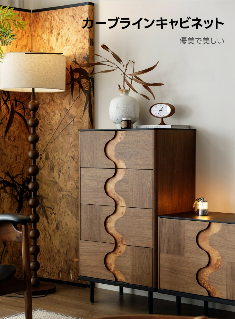 - 【洗練されたデザインと機能性】カーブラインキャビネットは、ジャパンディスタイルを取り入れた美しいデザインが特徴です。シンプルでありながら空間にアートな雰囲気をプラスし、リビングや寝室を一層引き立てます。大容量の引き出しとスムーズな開閉を実現する金属製スライドレールを備え、整理整頓がしやすい設計です。