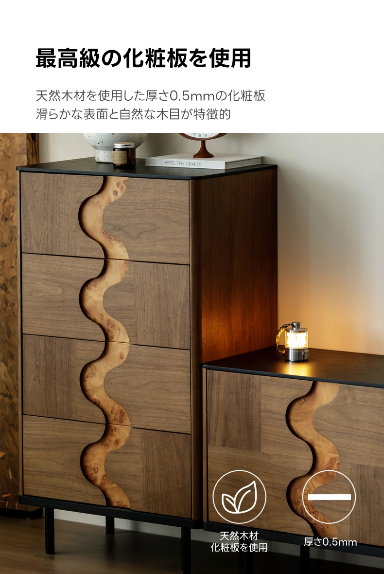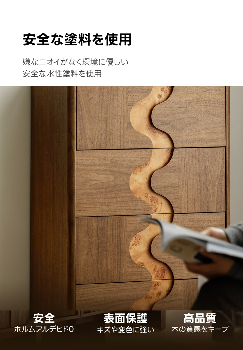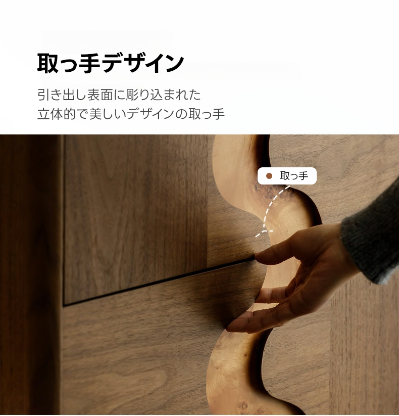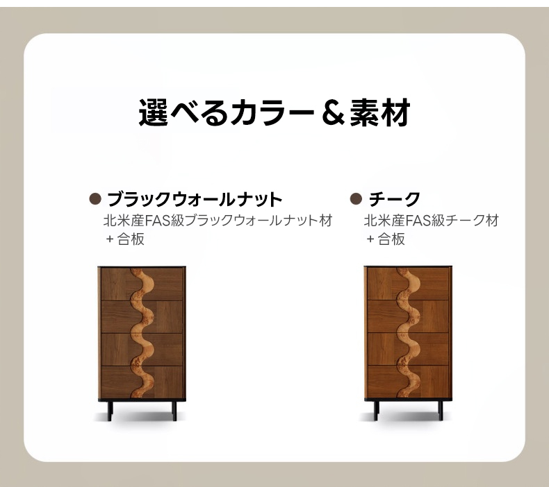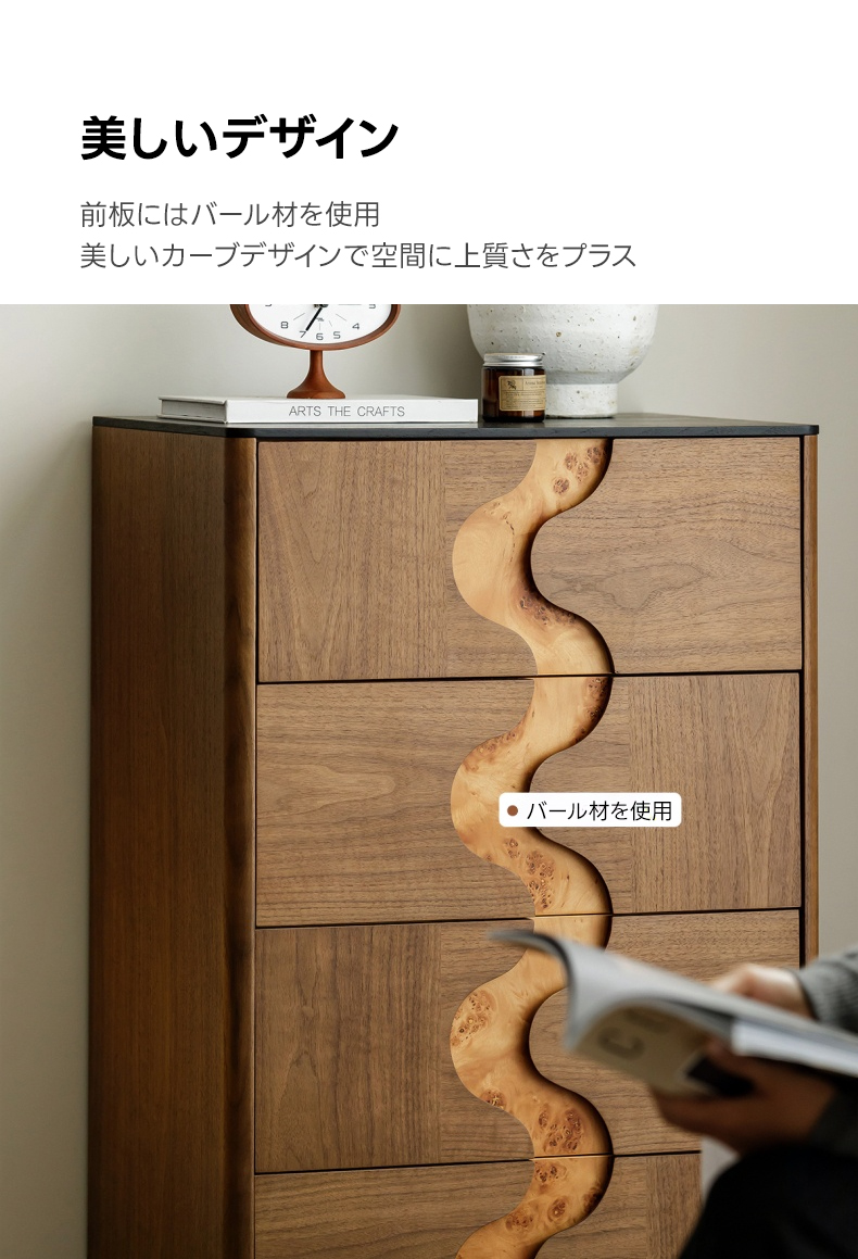 - 【高品質な素材とデザイン】北米産FAS級のブラックウォールナット材とチーク材を使用し、自然な木目が魅力的です。ブラウンとダークブラウンの2色展開で、どんなインテリアにも合わせやすいカラーリングです。前面のカーブデザインと立体的に彫り込まれた取っ手部分が、視覚的にも触覚的にも楽しめます。