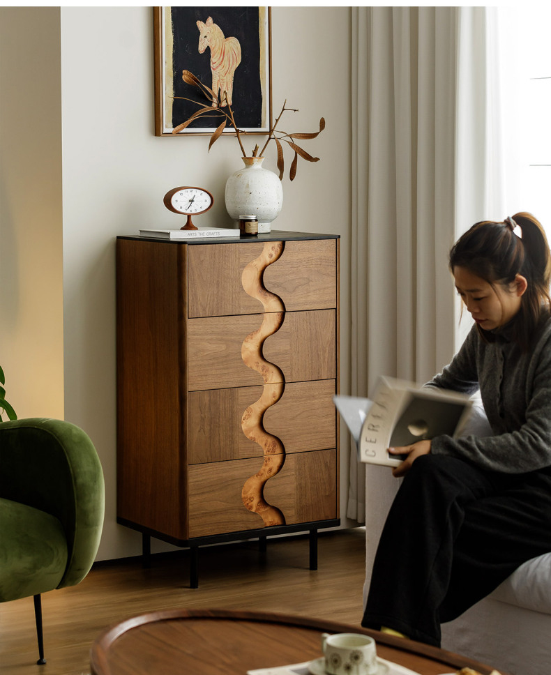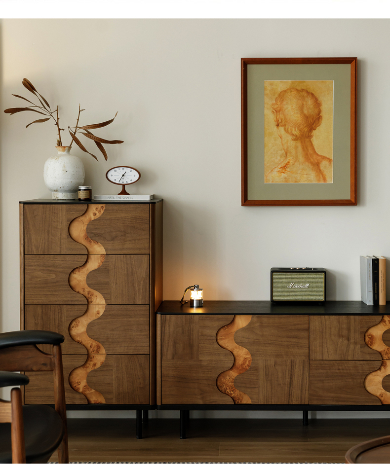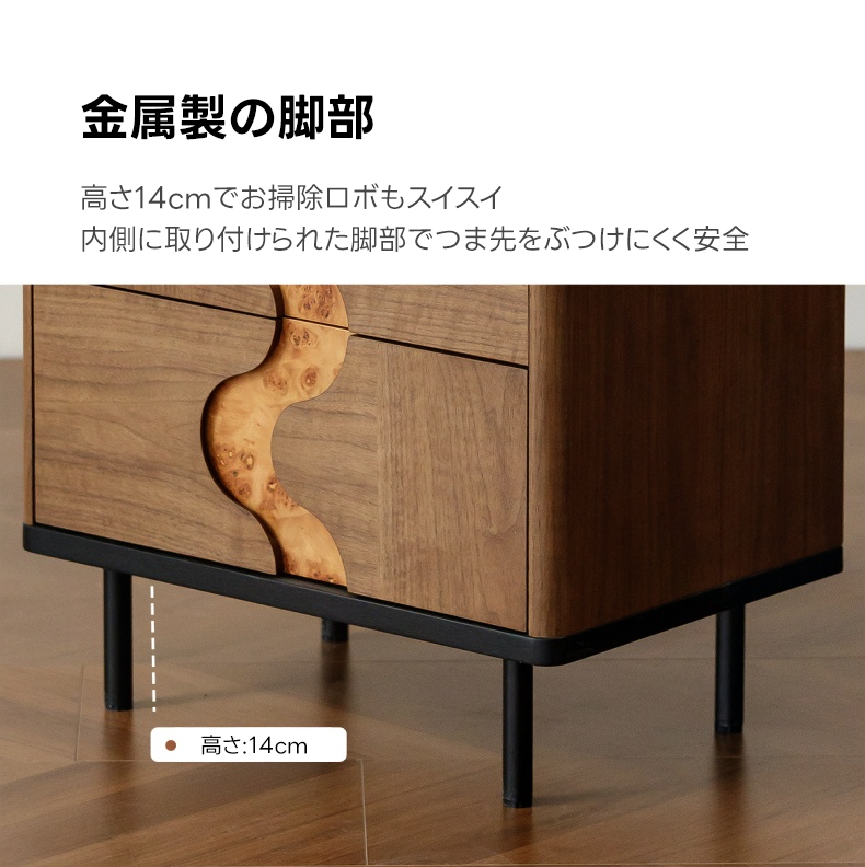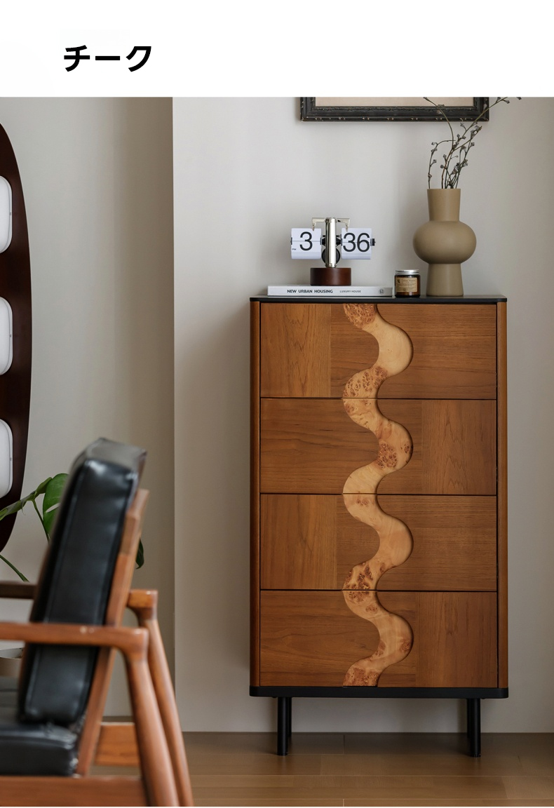 - 【高品質な素材とデザイン】北米産FAS級のブラックウォールナット材とチーク材を使用し、自然な木目が魅力的です。ブラウンとダークブラウンの2色展開で、どんなインテリアにも合わせやすいカラーリングです。前面のカーブデザインと立体的に彫り込まれた取っ手部分が、視覚的にも触覚的にも楽しめます。