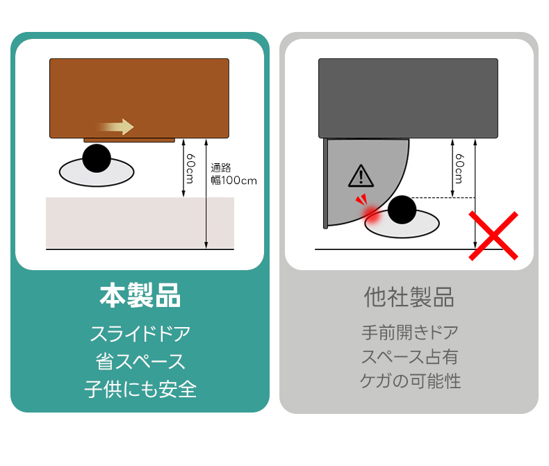 - 【省スペース設計】:スライドドアを採用しているため、スペースを有効に活用でき、狭い場所でも使いやすいです。304ステンレス脚を使用しており、長期間の使用に耐えます。