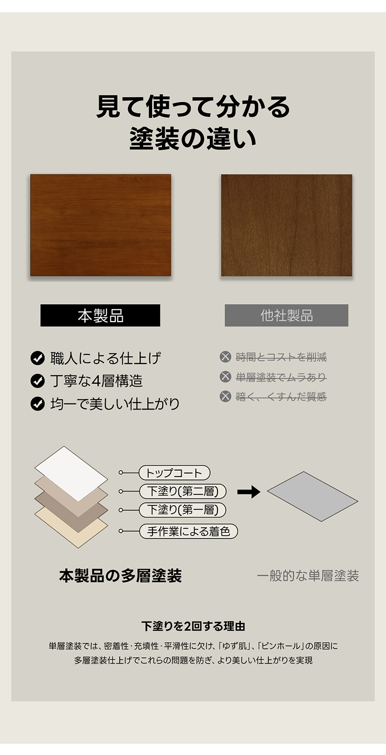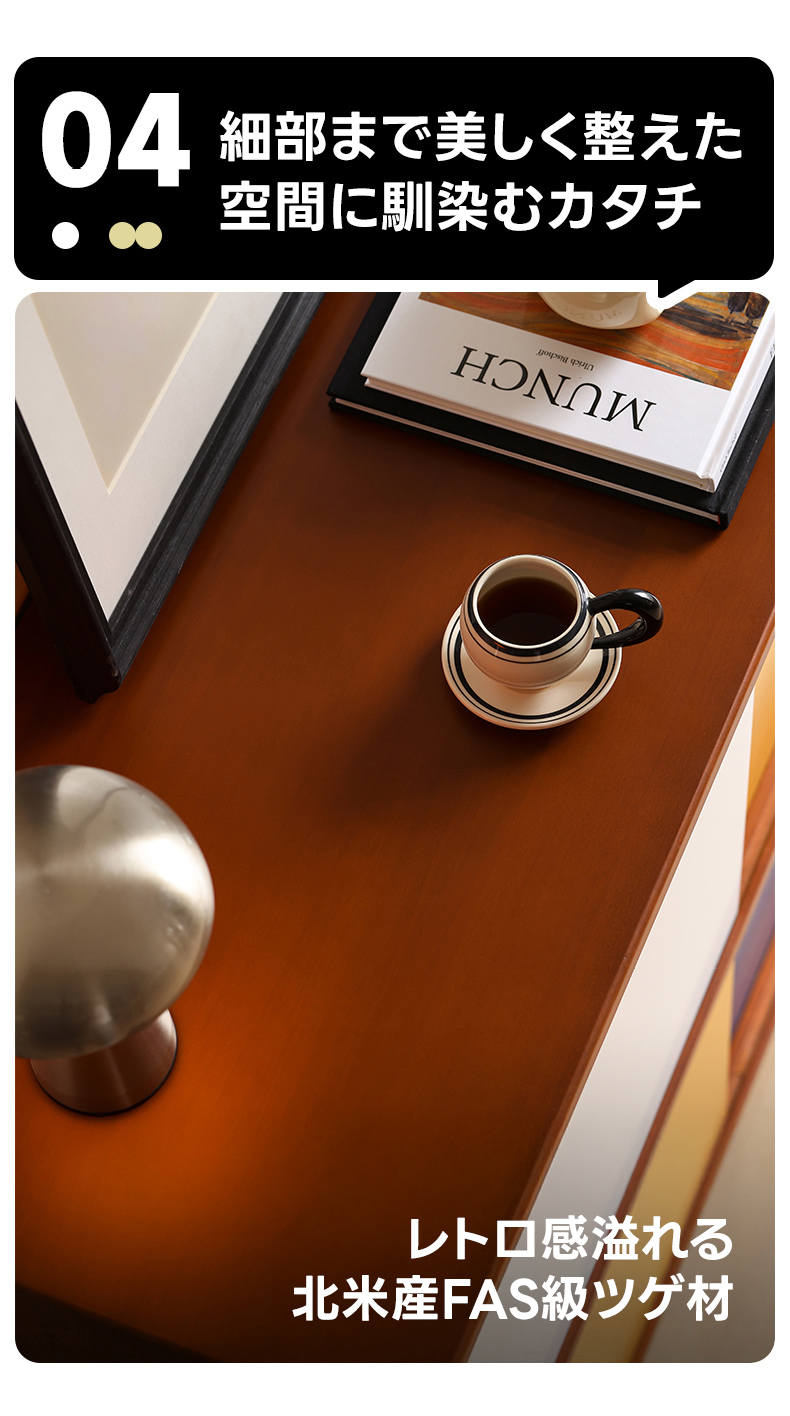 - 【高品質素材】:主材には北米産FAS級ツゲ材を使用し、耐久性と美しさを兼ね備えています。補助材にはENF級積層合板とMDF板を使用し、環境に優しい設計です。熟練した職人による多層塗装が施されています。